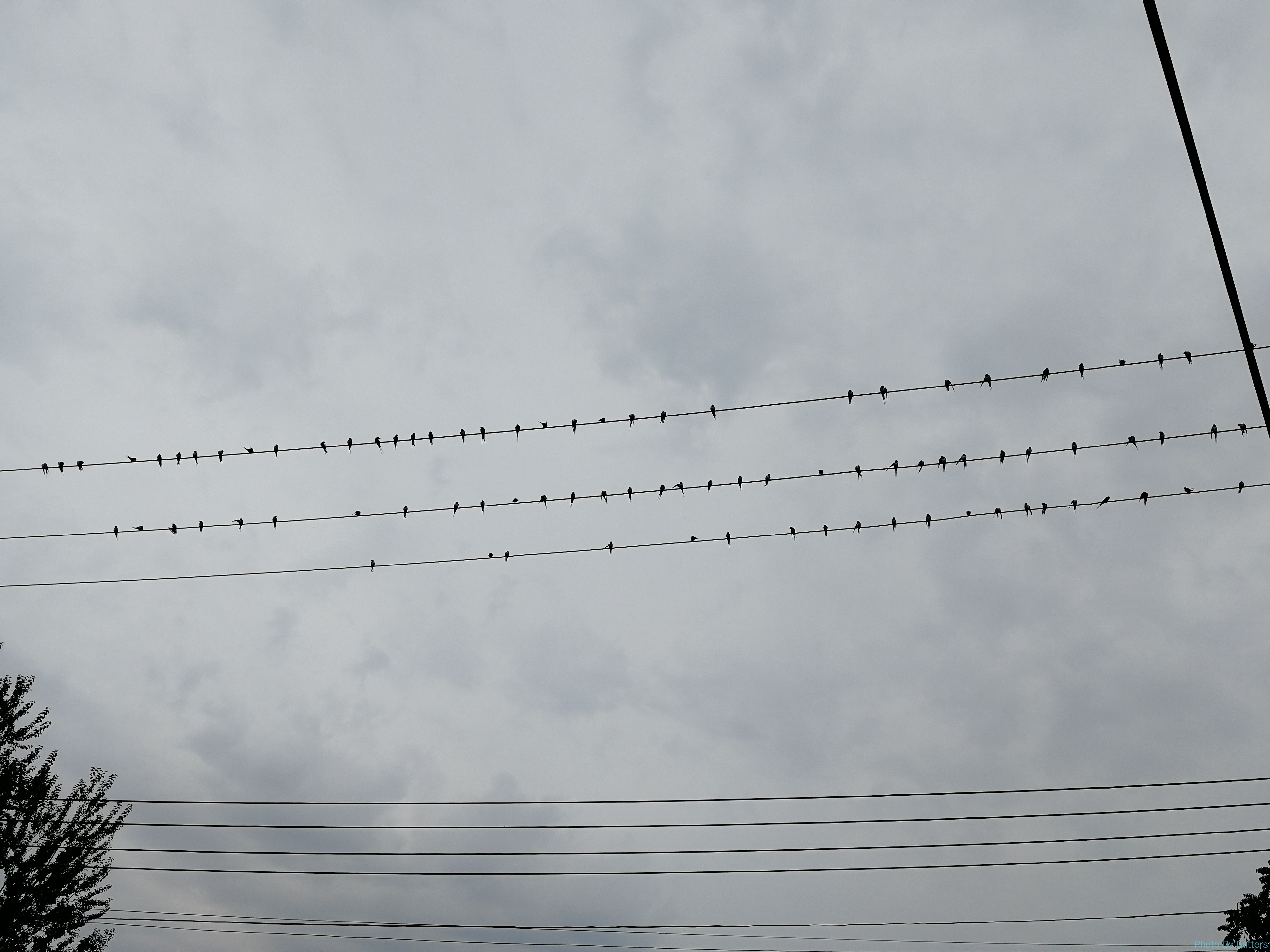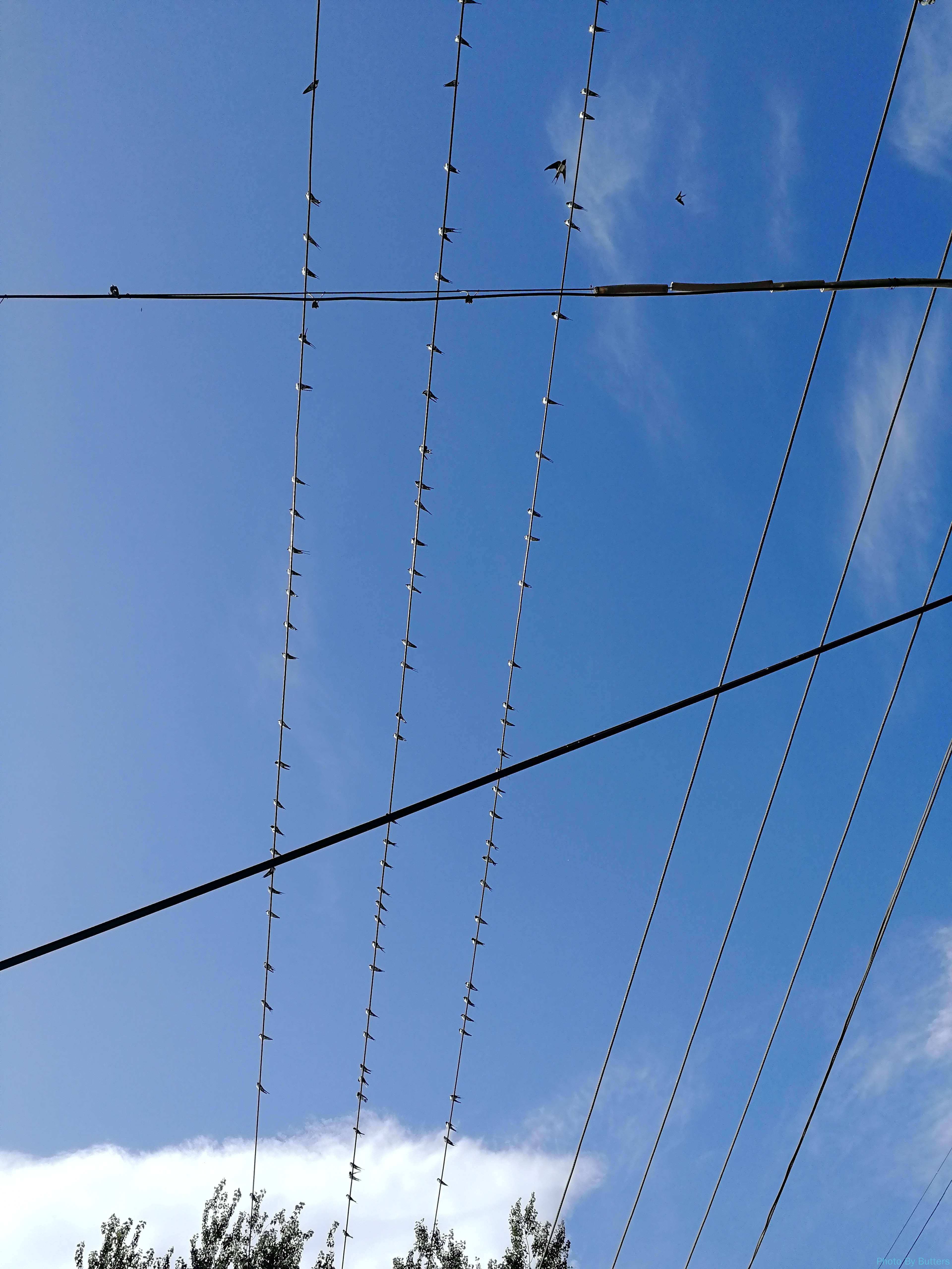 Every morning, there stands a bunch of swallows on these wires, and leave a projection of the wires on the ground.