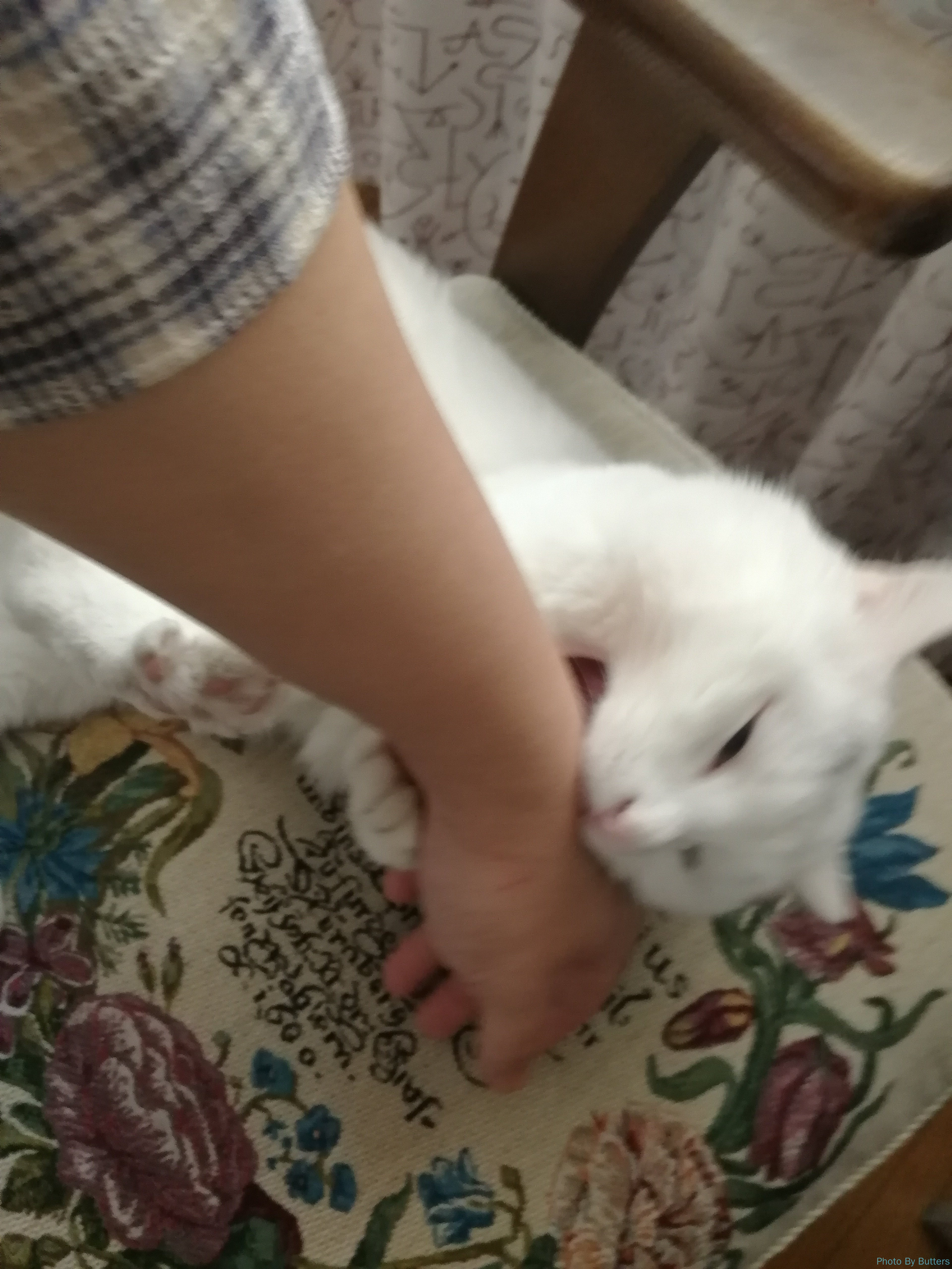 White loves to stretch his legs straightly out. He may looks like a cute little cat, but he bites with no holding back.