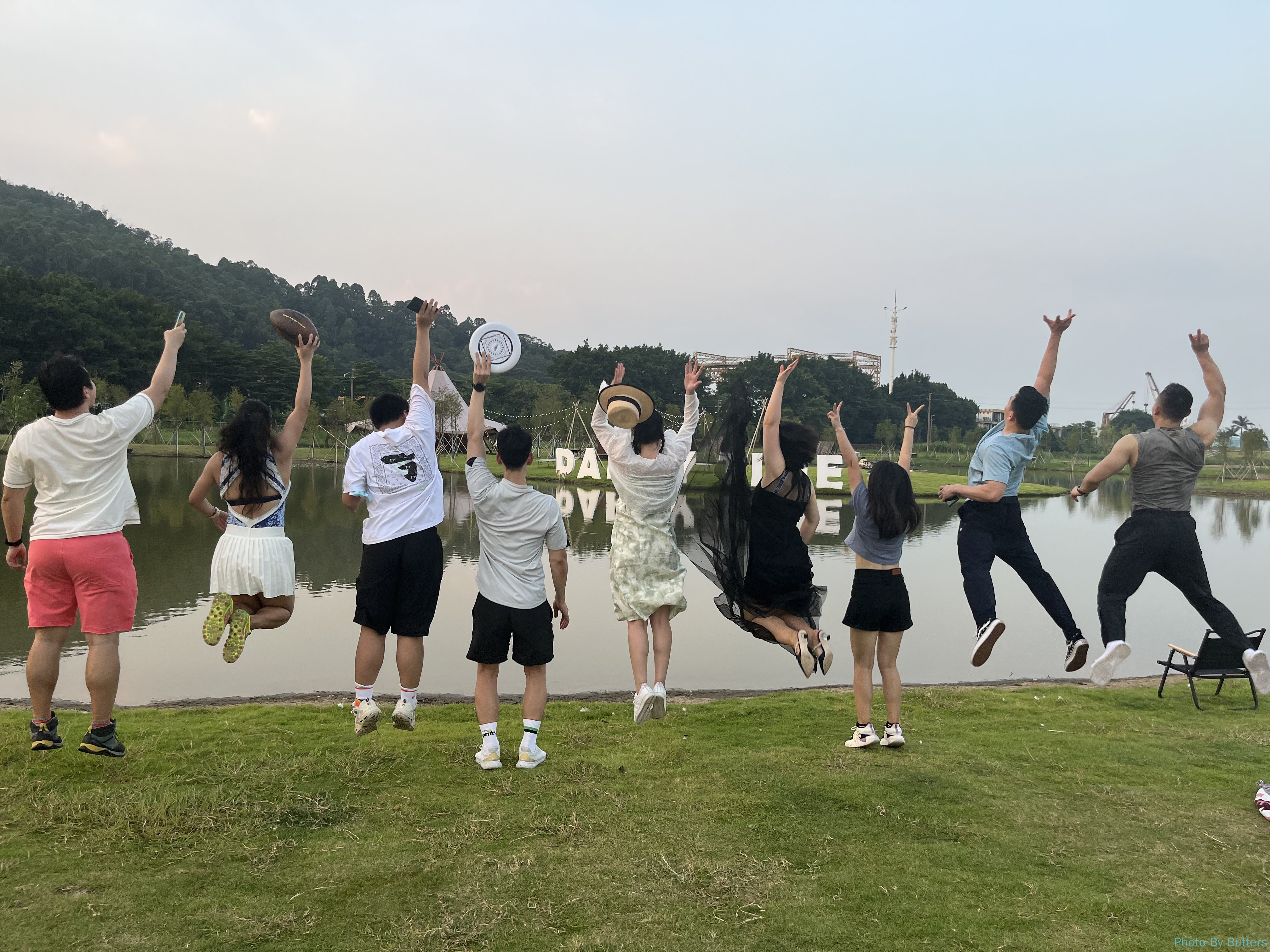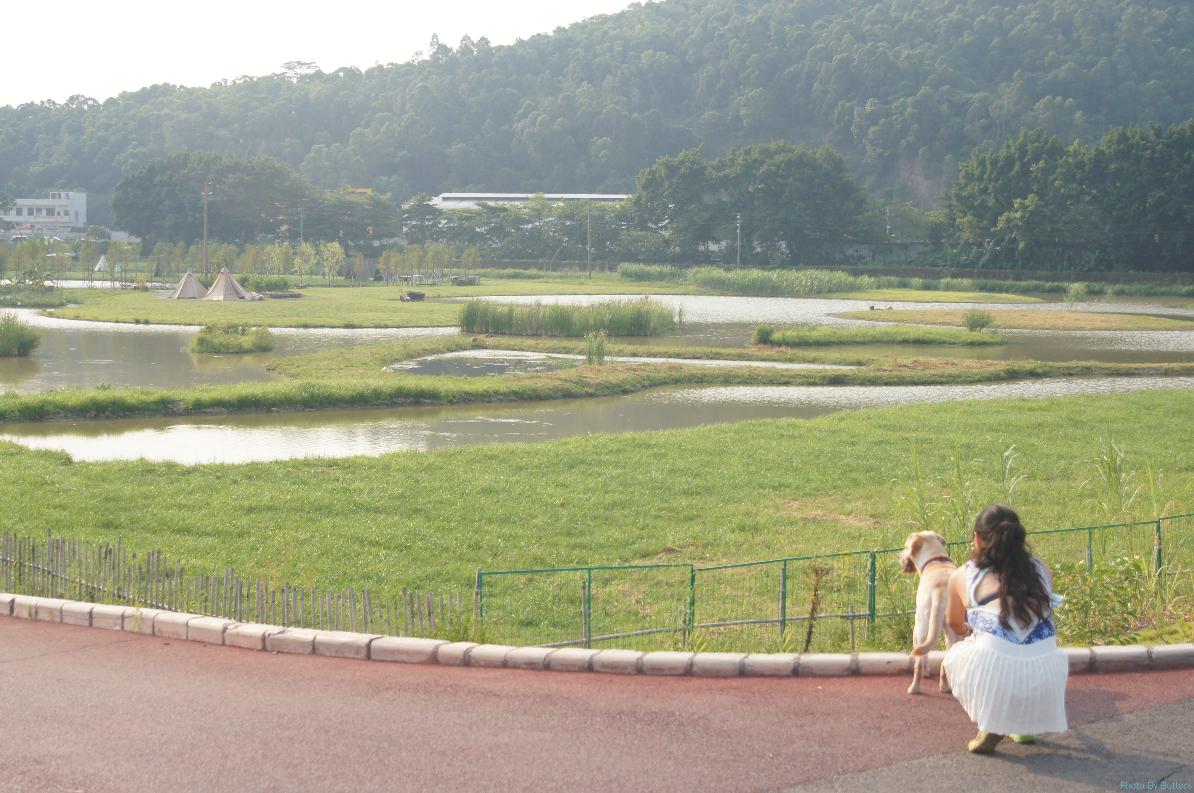 Friends organized a camping event, and we would love to tag along. The camping site is near Nansha district. It looked like a un-used wetland by the river, and then reconditioned into ponds and lawns for camping. We needed to prepare for nothing except food and entertainment, since the camping tents and grill were all set up when we arrived. We brought an american football and a frisbee, and experienced the two hottest sports just a little bit. Interestingly Xiao Liu (the labordor) showed no interest to the frisbee.