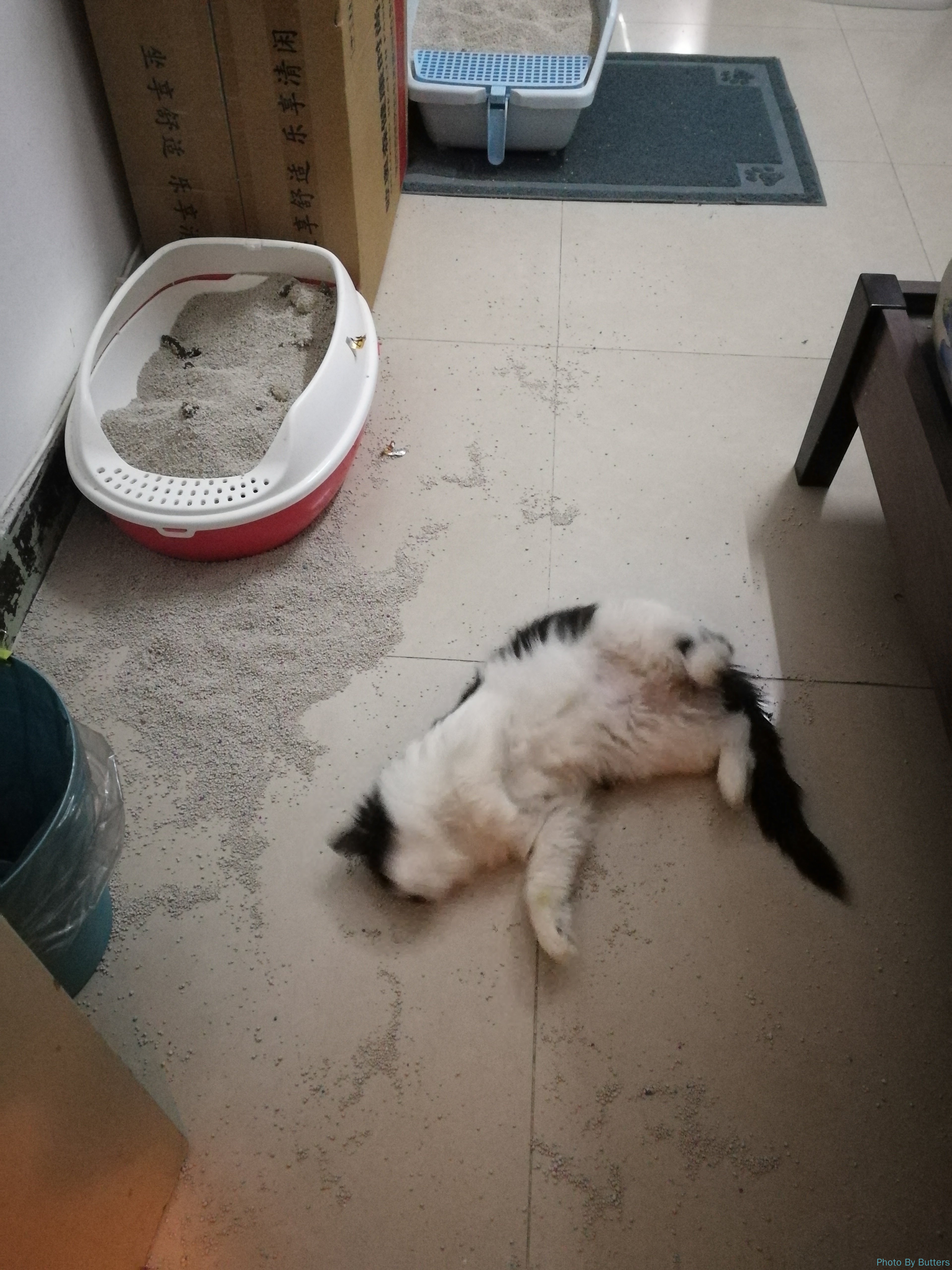 这个十一多在北京待了几天,见识到了假期的客流量。十一结束回到家中,看到一个满是屎的砂盆、一个没被碰过的砂盆、一地沙子和打滚的 Eva。