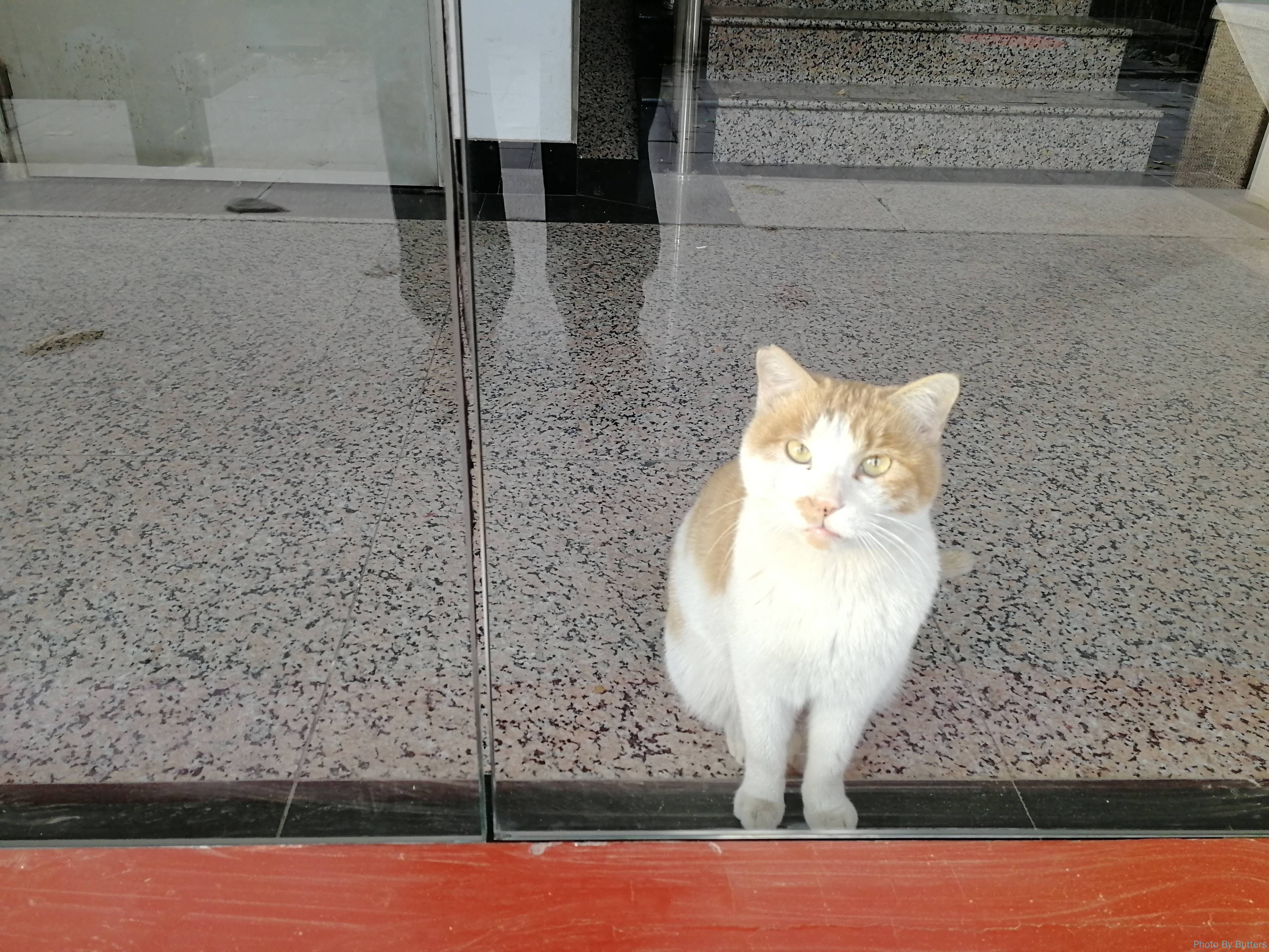 一只黄白猫,守在办公区的玻璃门内。它一直叫,让人来给它开门,它要出来溜达。上次来看到这里有不少猫,但这次只看到了这一只,但展厅外墙下有很多公益组织搭建的猫屋。