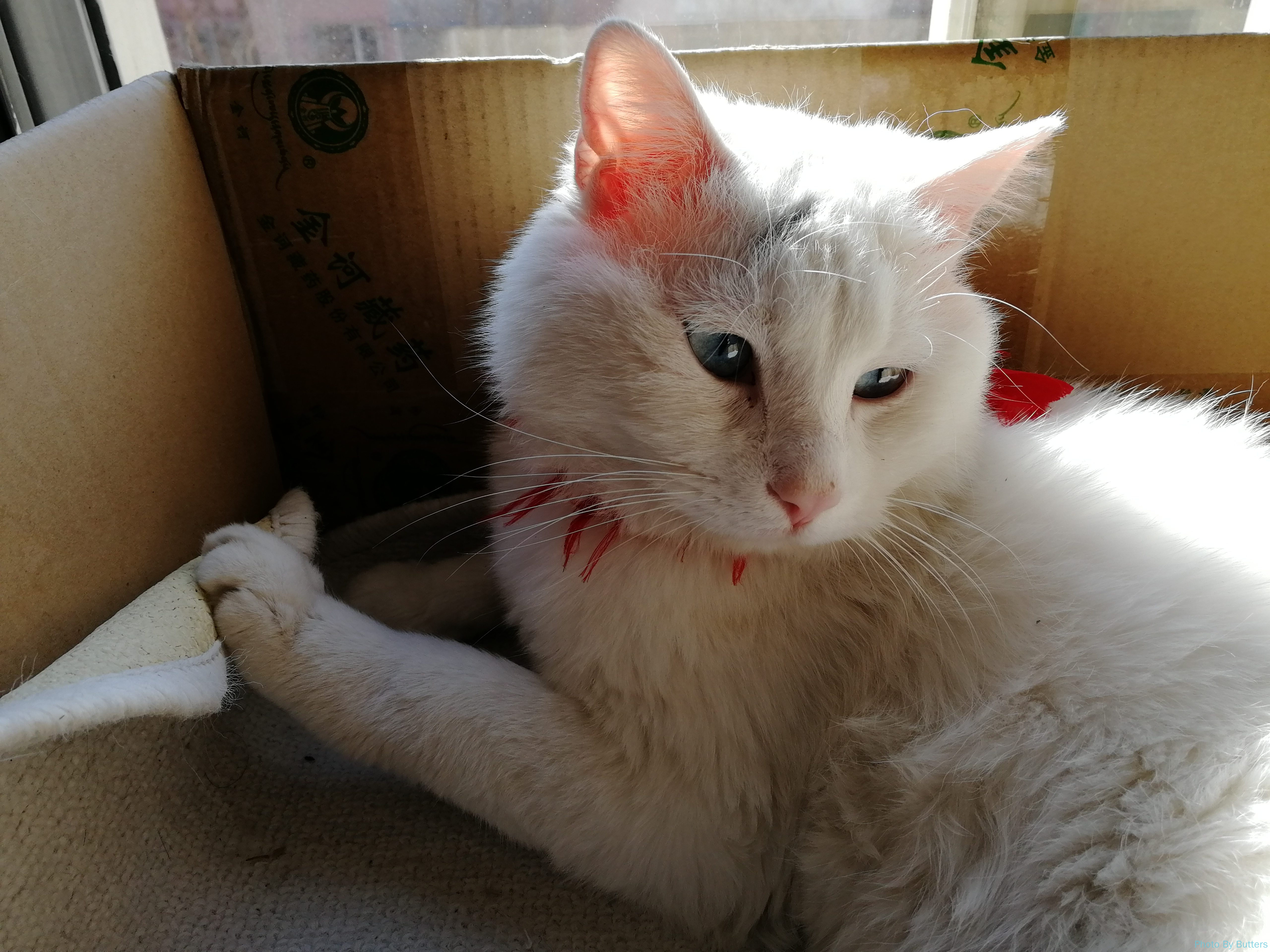 左顾右盼的长毛白猫。