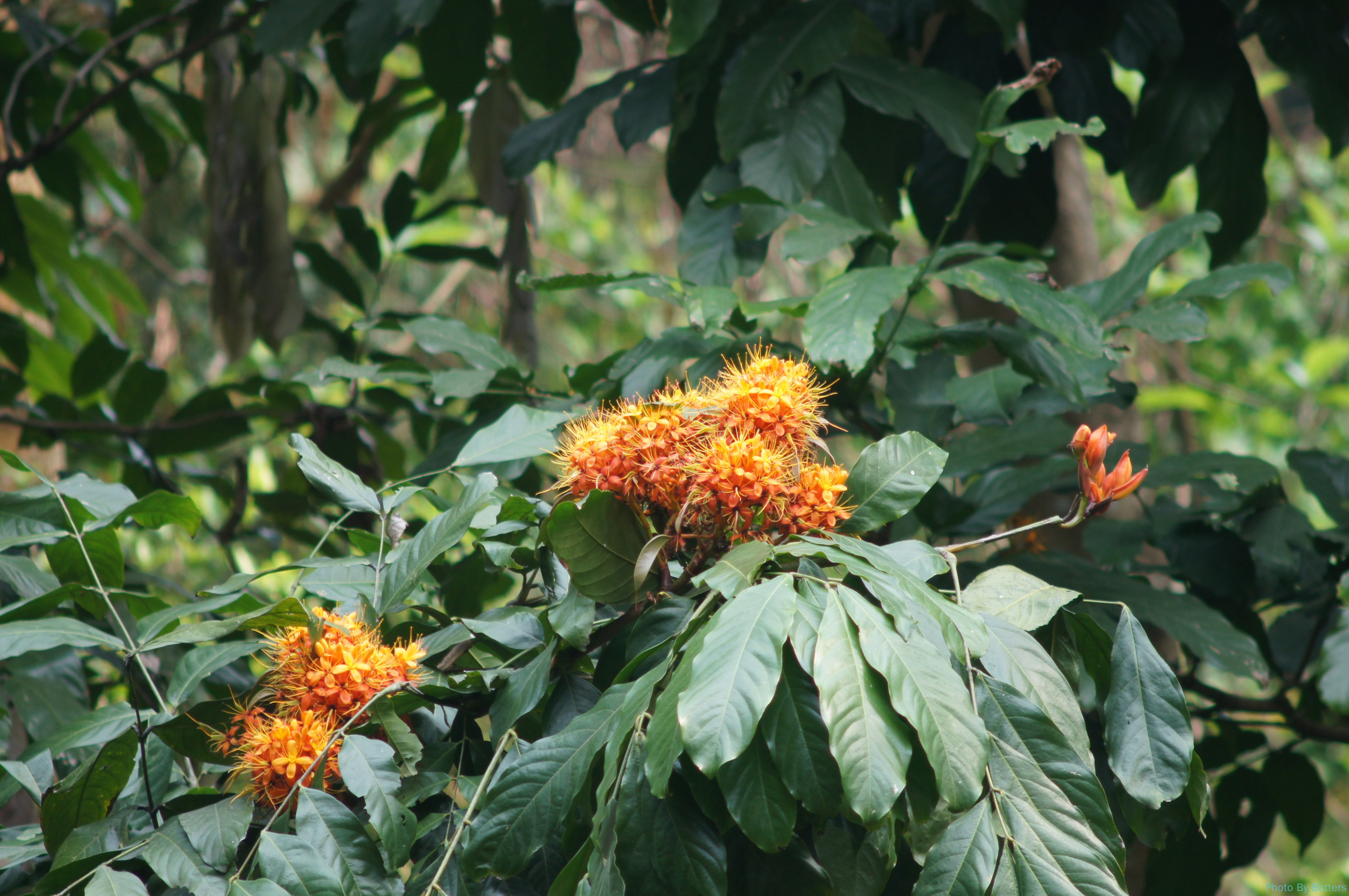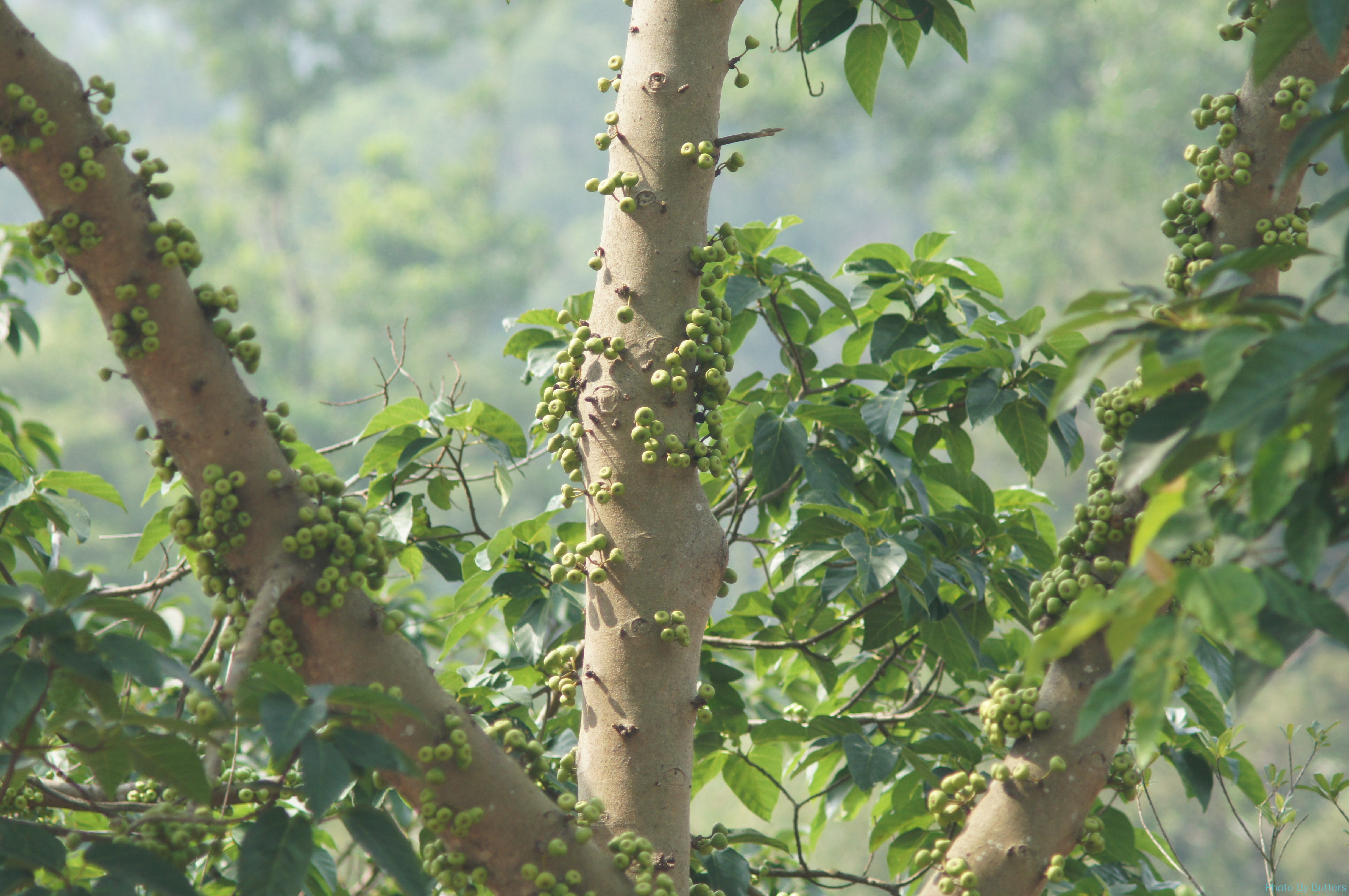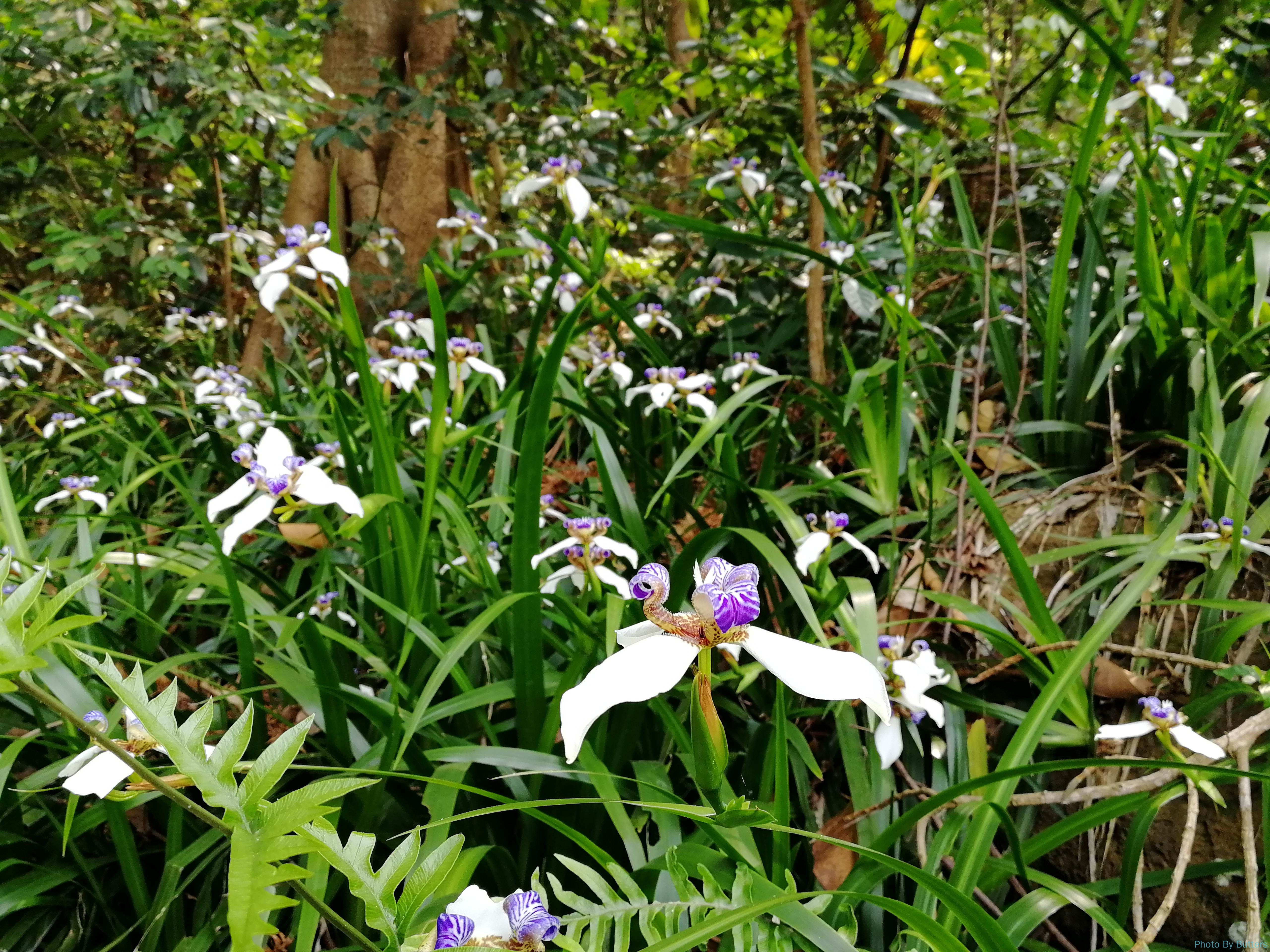 山上看到了非常多的蝴蝶。有一种黑色的翅膀上有一个蓝色斑点的很多见,非常好看。我们还在路上看见树上挂着一只巨大的蝴蝶。