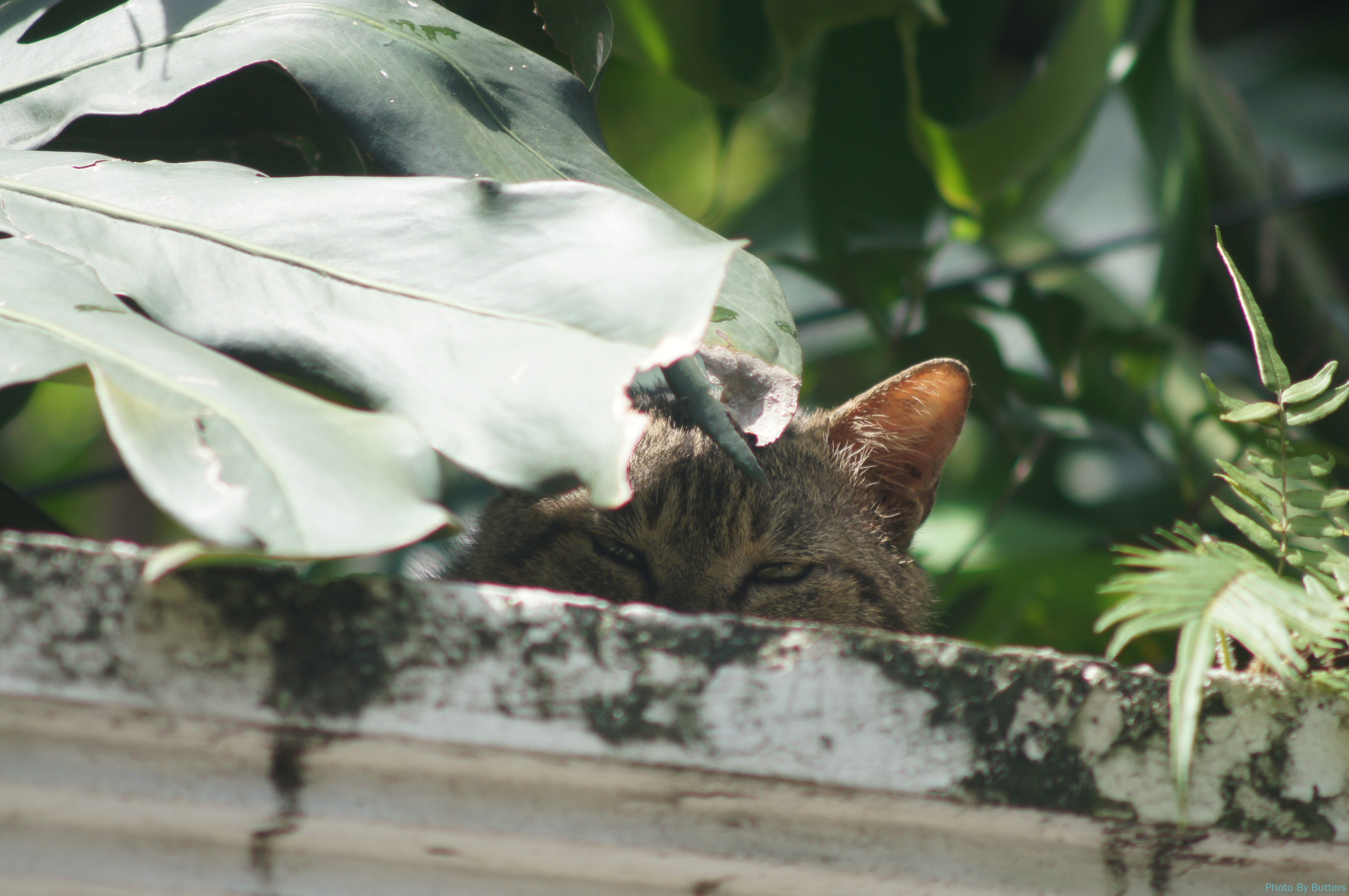 突然下起了大雨。一只猫跳上墙头,找了一片大叶子在下面躲雨。不一会儿雨就停了,从暴晒到暴雨再回到暴晒,就用了不到半个小时。这只猫大概忘记了自己之前要去哪里,索性就继续在这里睡起了觉。