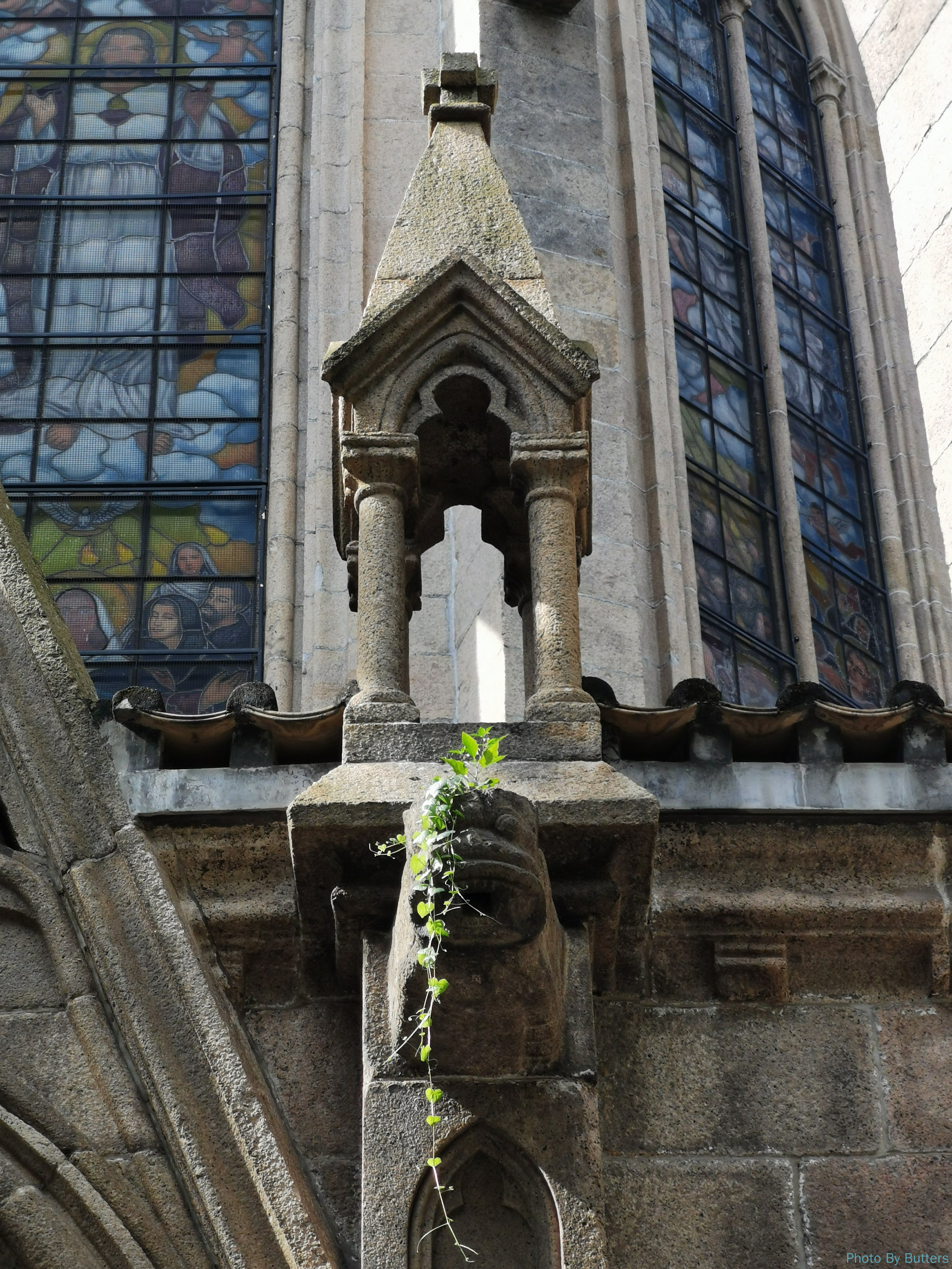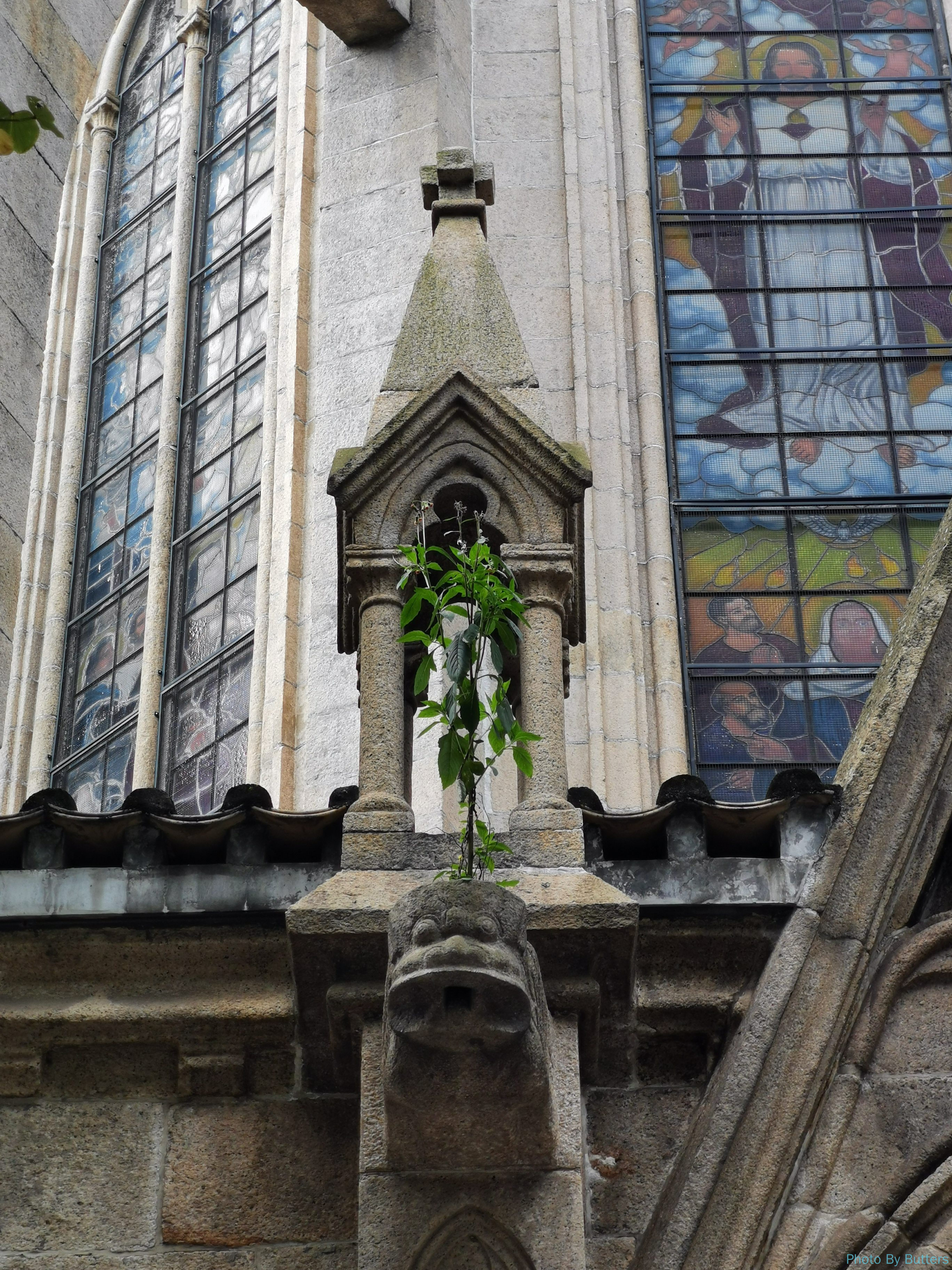 几乎没有人会绕到教堂的后面。后门上的滴水石兽脑袋上长出了绿植,好像梳了辫子。
