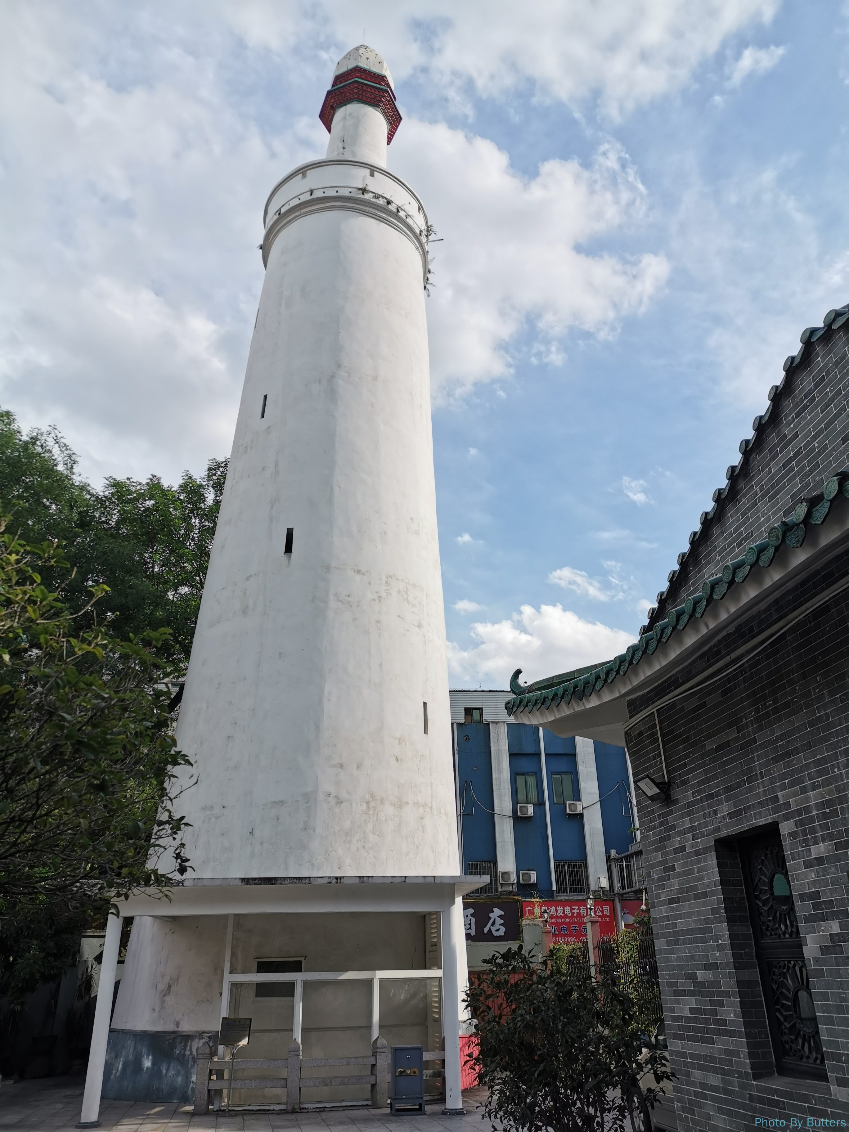 怀圣寺又称光塔寺、怀圣光塔寺、龙凤寺、礼拜寺等,始建于唐代,是中国现存最早的清真寺,甚至是世界最早的清真寺之一。光塔位于寺门西南隅,正式名称“怀圣塔”,因教徒在诵经时常在塔顶用阿拉伯语呼喊“邦卡(呼唤之意)”,也被称为“邦卡楼”。粤语里“邦”与“光”谐音,另外塔位于珠江边,唐朝时入夜后塔顶悬灯来为来往的船只导航,故人称“光塔”或“番塔”。此塔建于唐朝贞观年间,具有阿拉伯风格,高36米,青砖砌筑,底为圆形,表面涂有灰沙,塔身上开有长方形小孔用来采光。塔内有二螺旋形楼梯绕塔心直通塔顶。塔顶部用砖牙叠砌出线脚,原有金鸡立在上面,可随风旋转以示风向,明初被飓风吹落,1934年重修时改砌成尖顶。