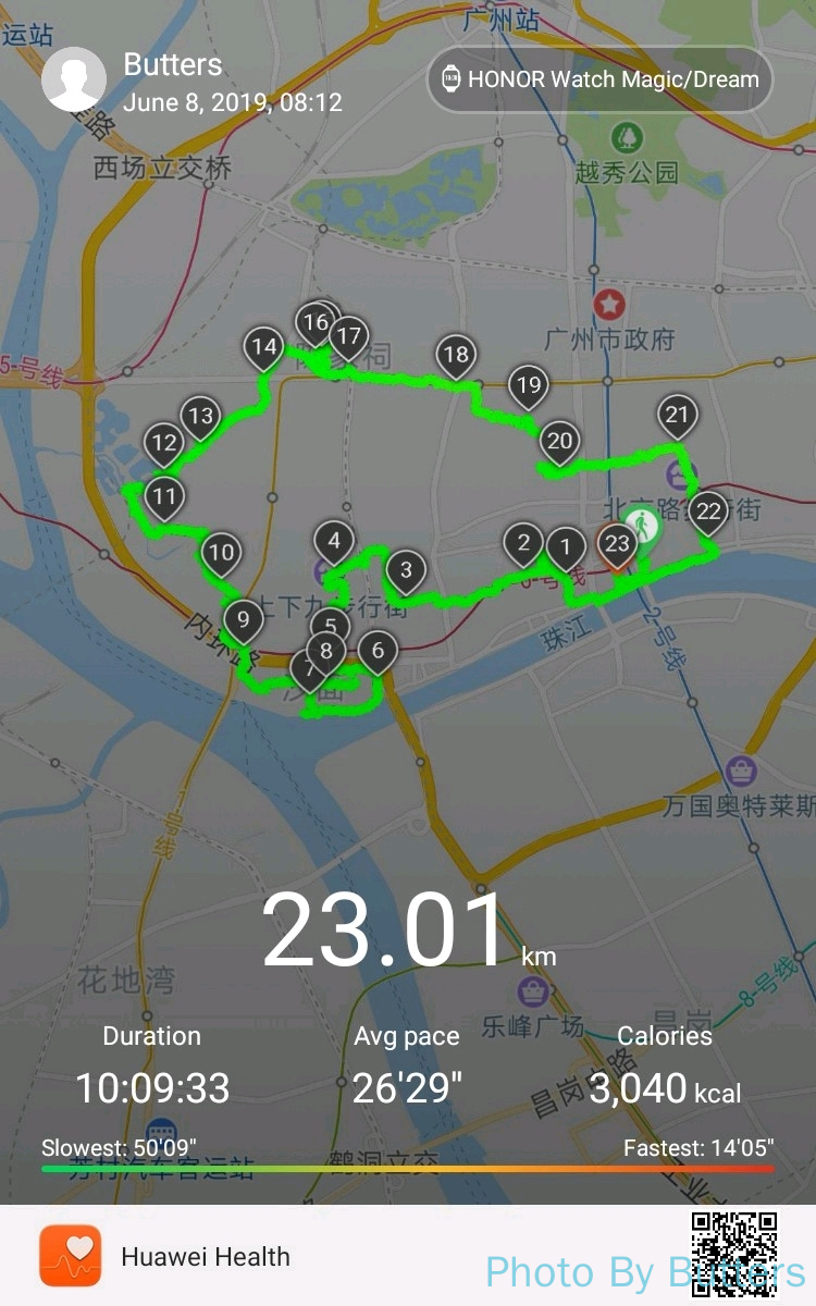 从海珠广场出发,最后意外地回到了海珠广场,记录到的路程有 23 公里。除了以上的景点外,路上也看到了很多有意思的东西。