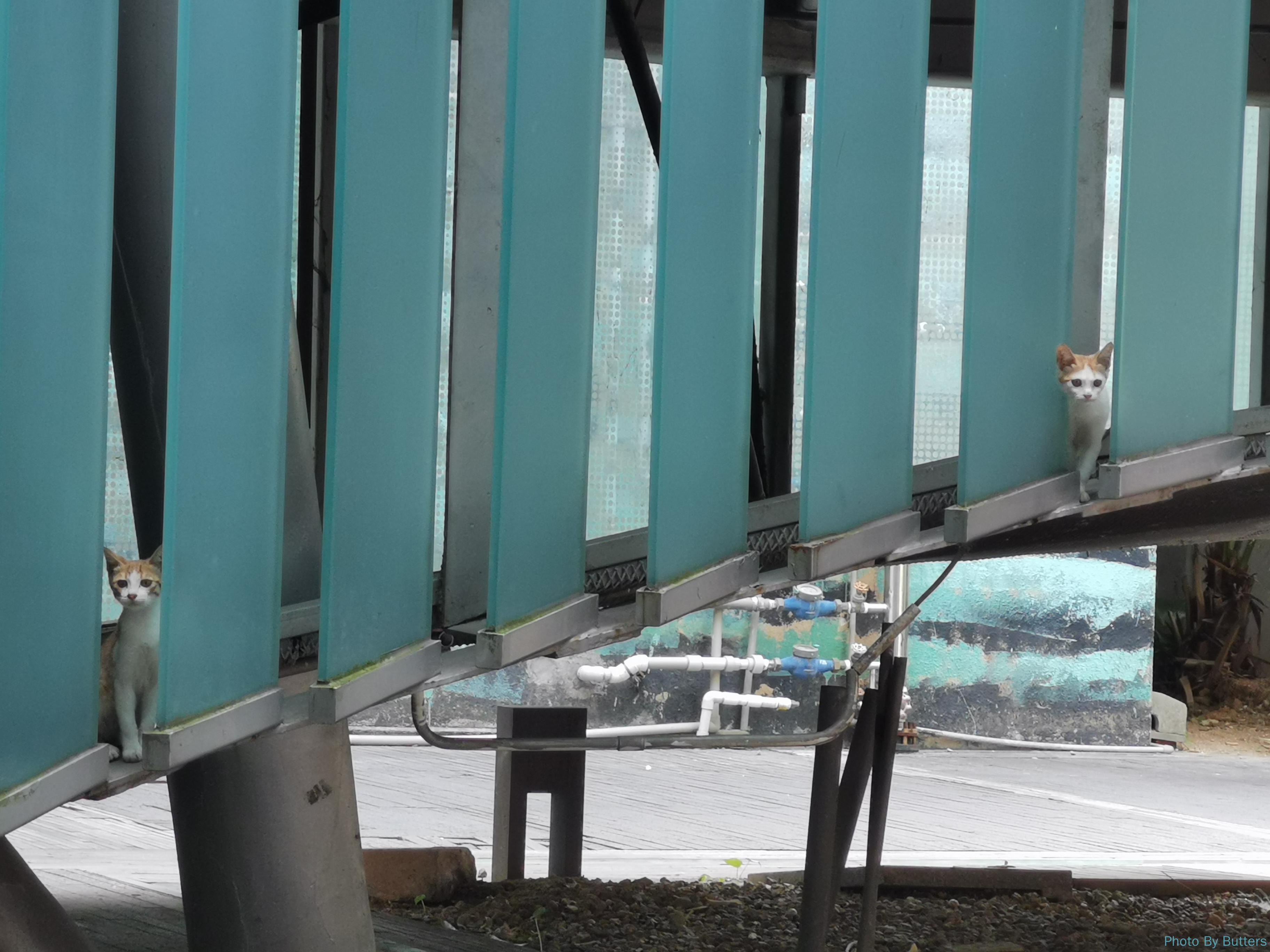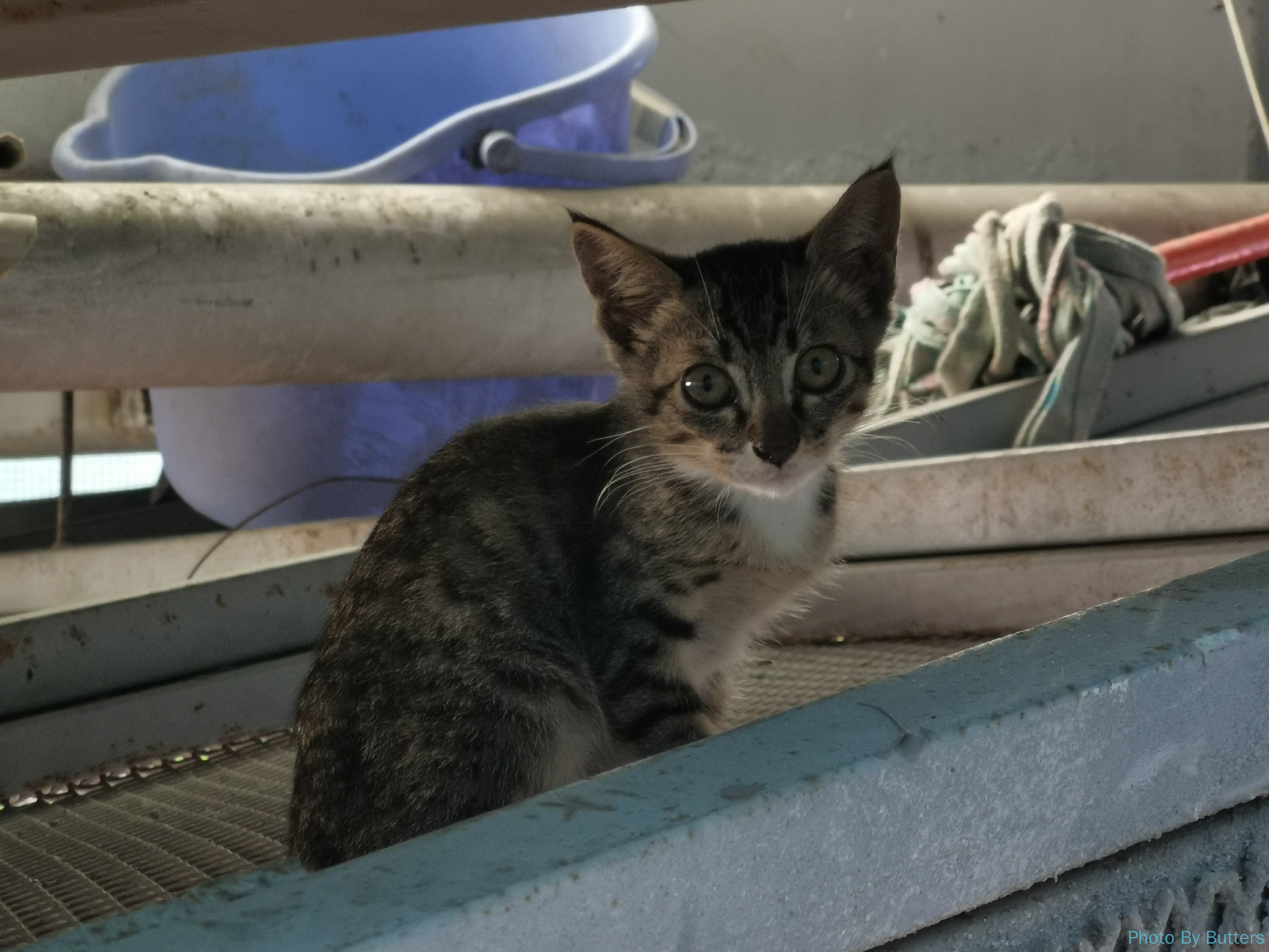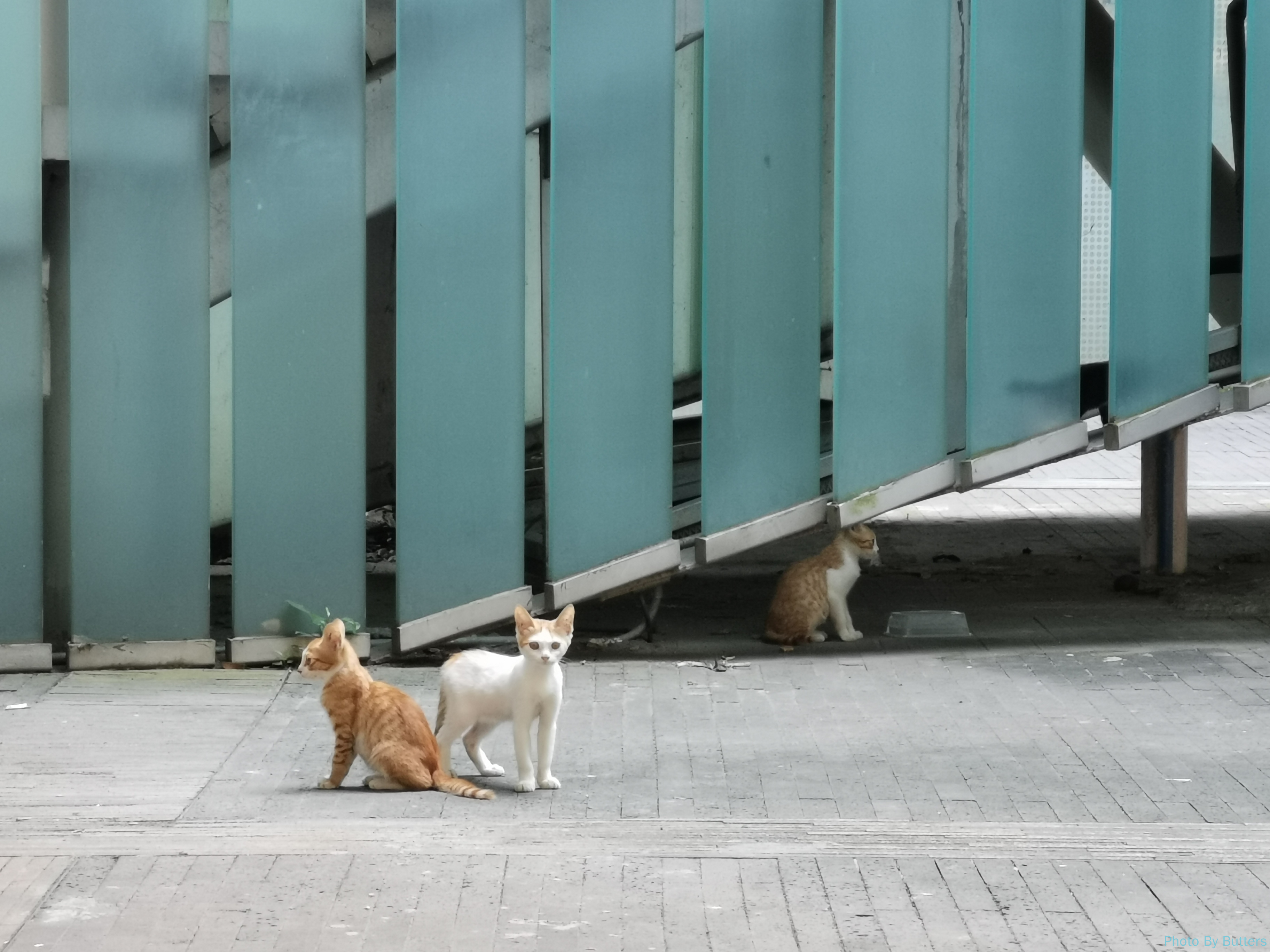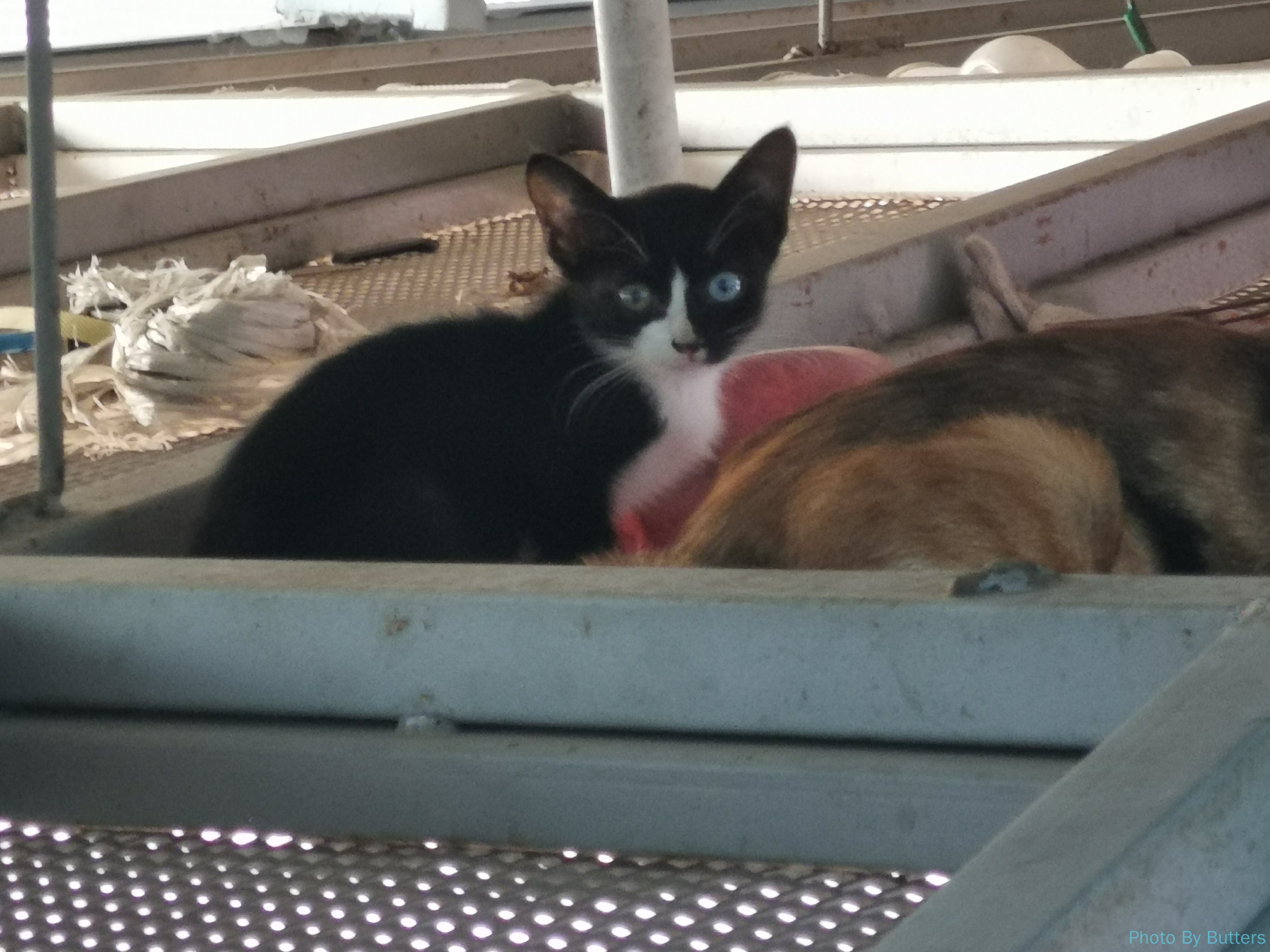 在一个楼梯的下面,出现了很多小猫。其中有一只是异瞳的奶牛猫,我还是第一次见到。