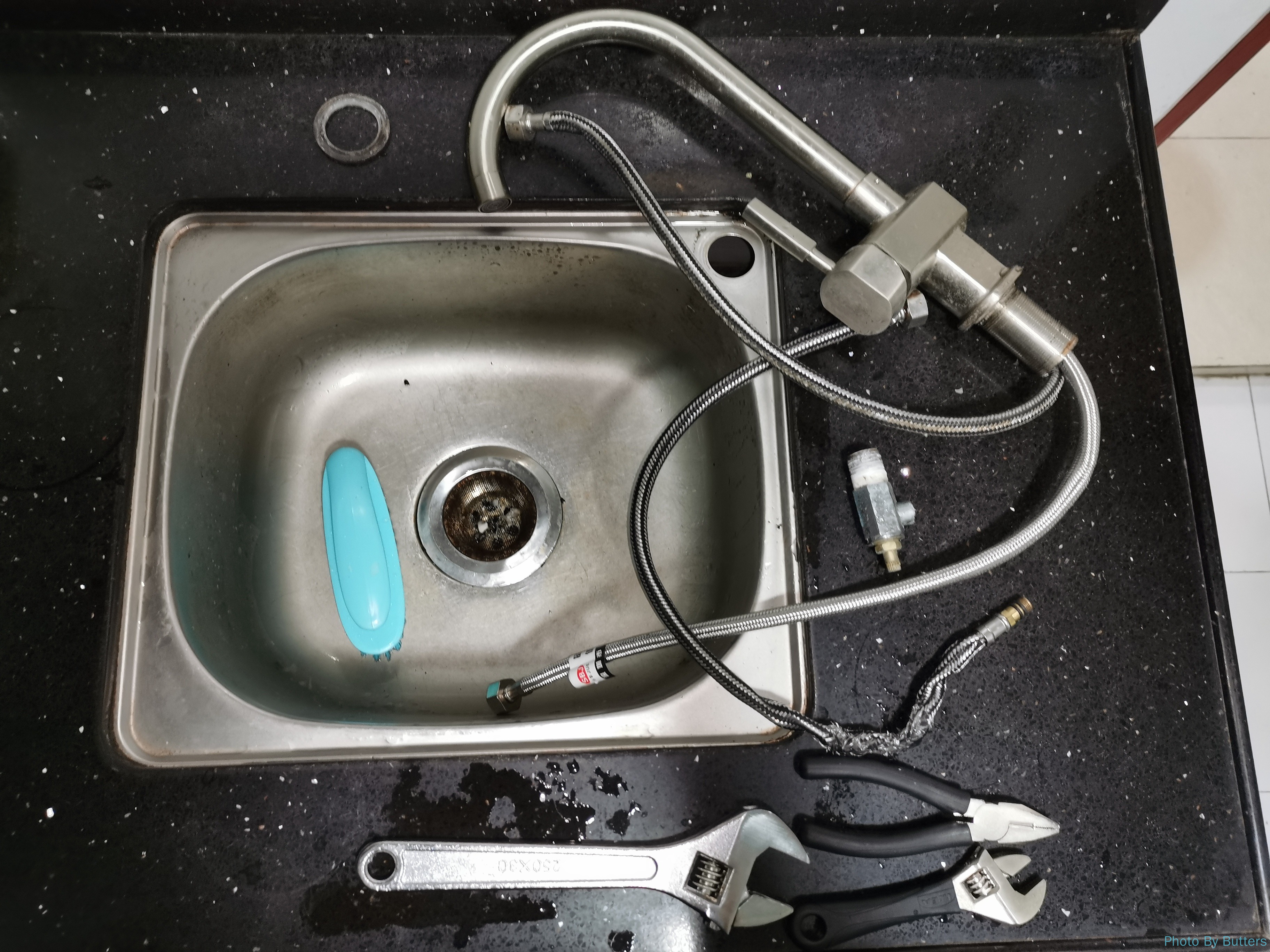 篮球赛的最后一场,临走时看到厨房有积水,发现水槽下面的水管角阀坏了。叫物业修的话要等到明天,今天打完球就不能洗澡了。于是决定自己上手,去五金店买了新的水管,借老板的工具拆掉了水龙头的接口。完成后很有成就感,而且还顺道清理了柜子里的蟑螂尸体。