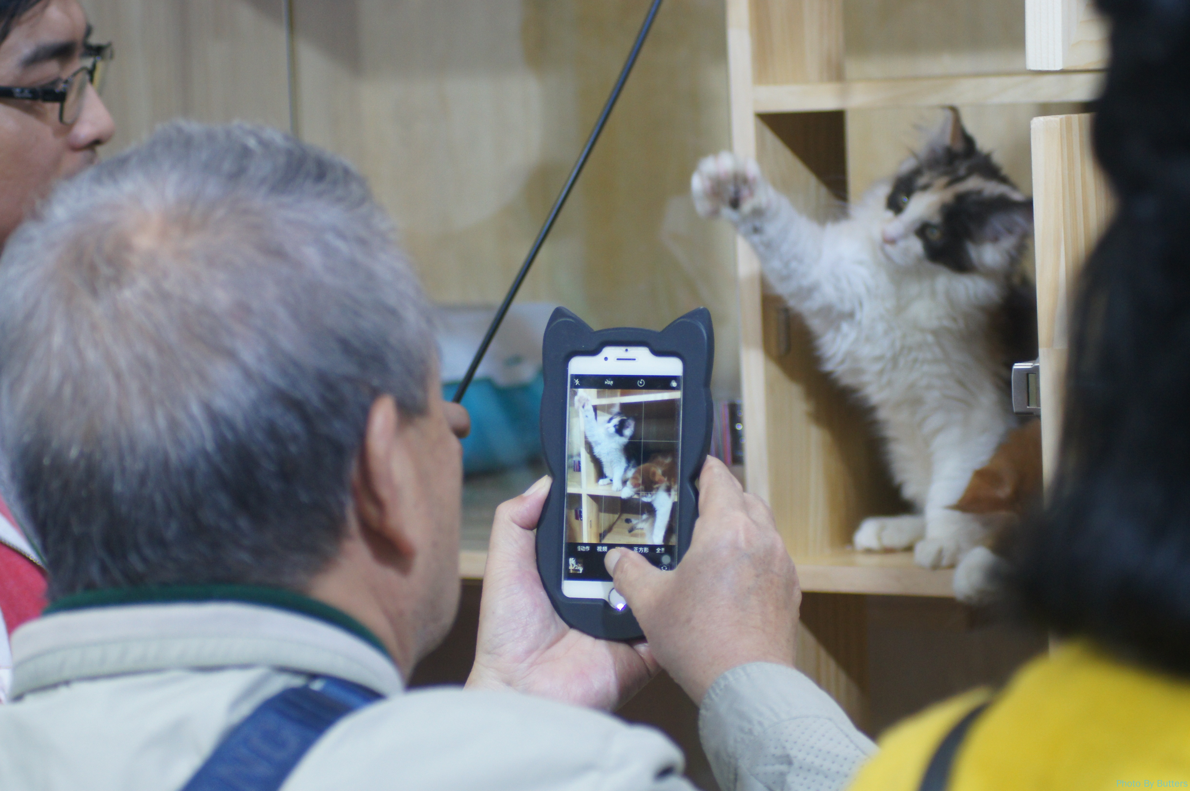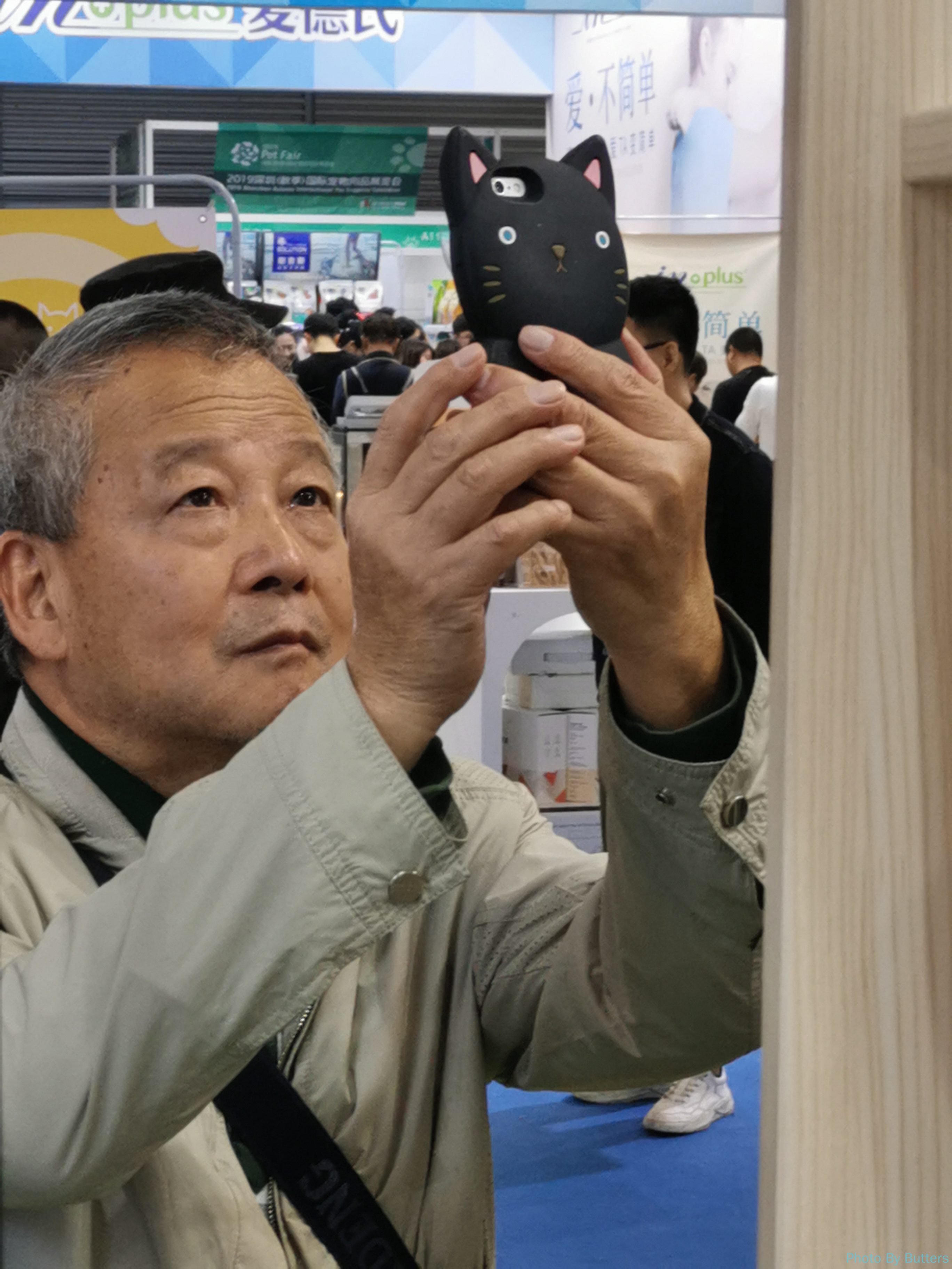一个老年猫痴大叔的手机壳是一个可爱的猫咪形状。为了拍手机壳,我跟着大叔逛了一整圈展馆。
