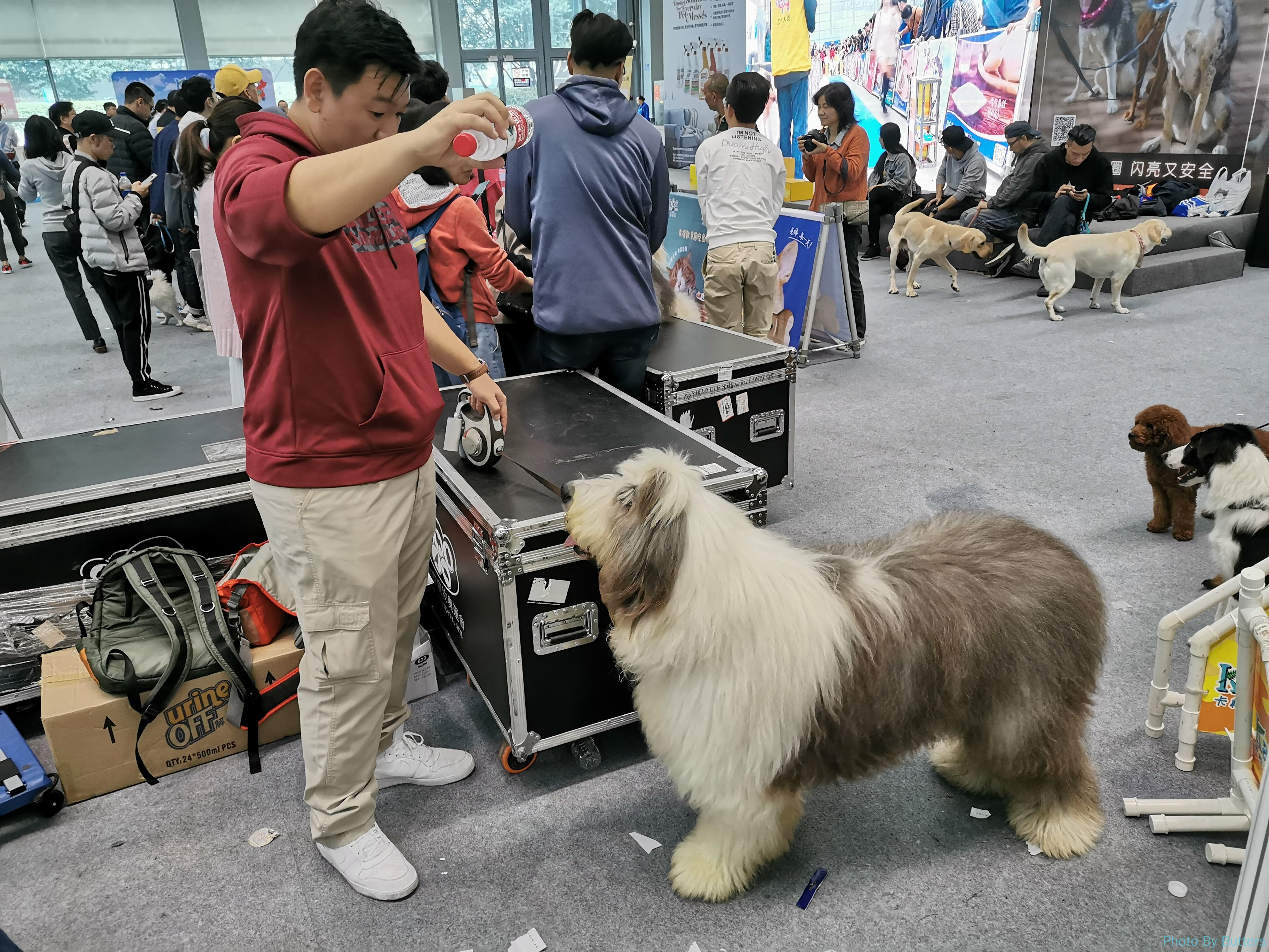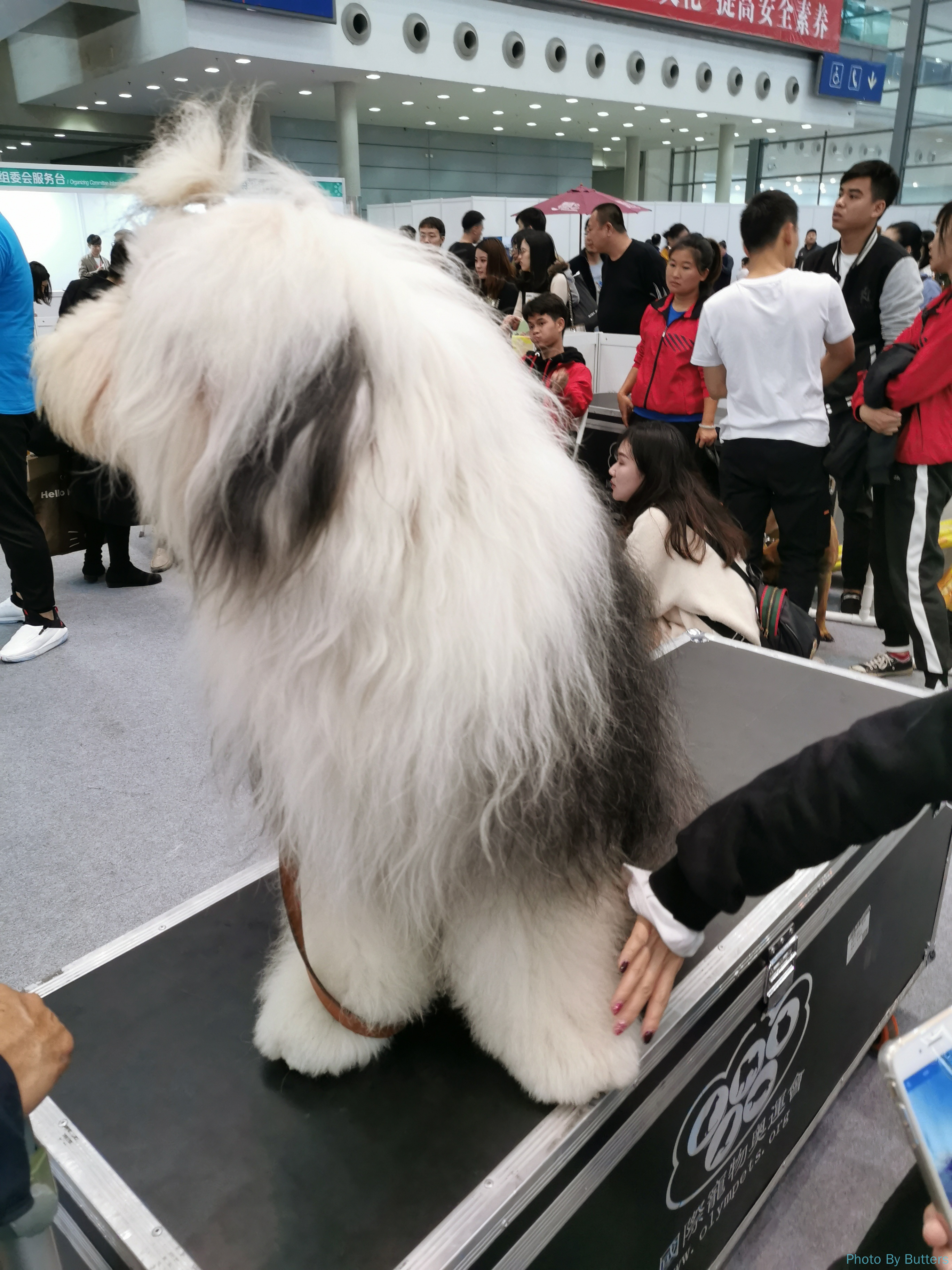 会场的比赛场地有两只大号的英格兰牧羊犬,浑身毛茸茸的。