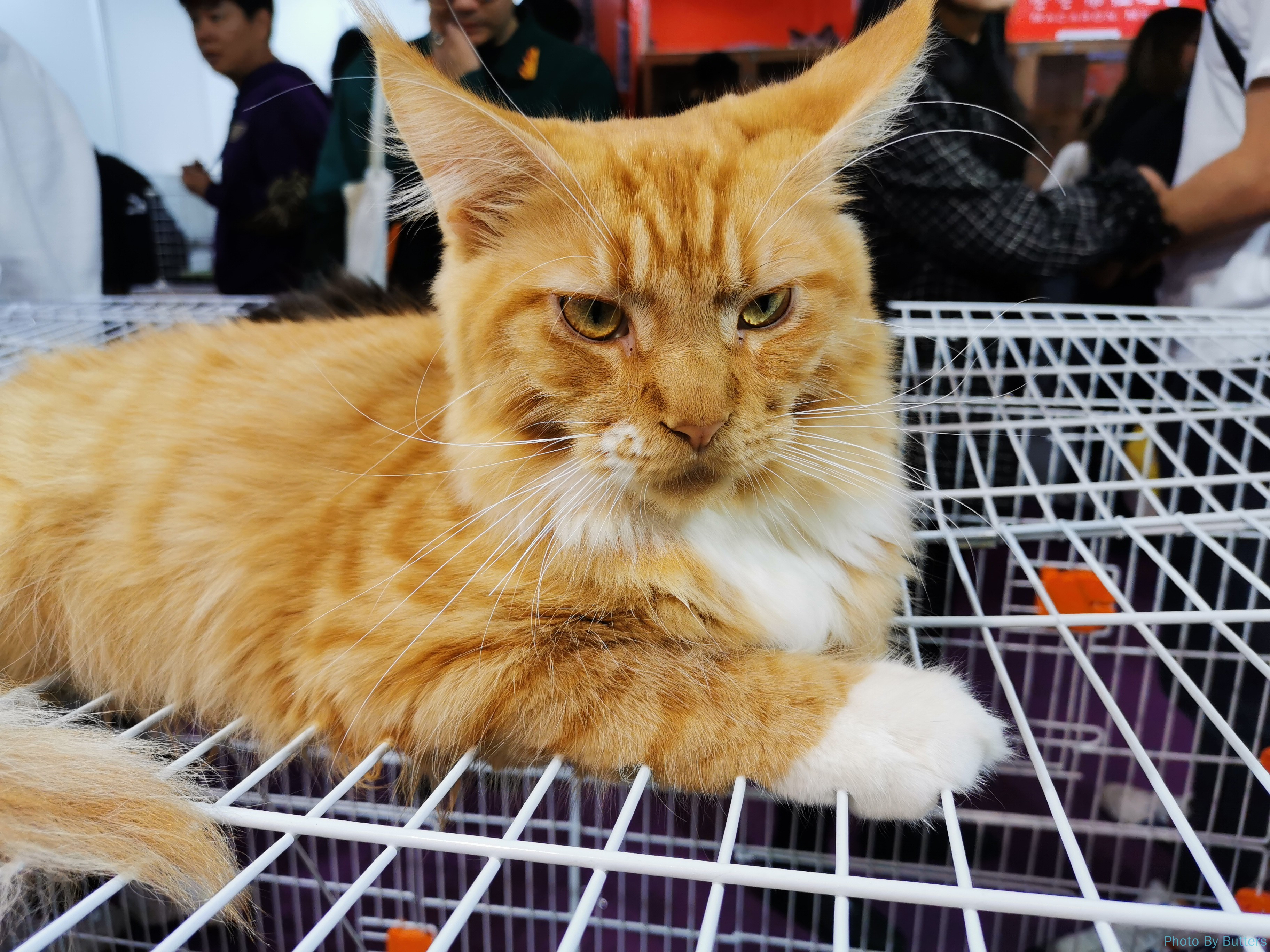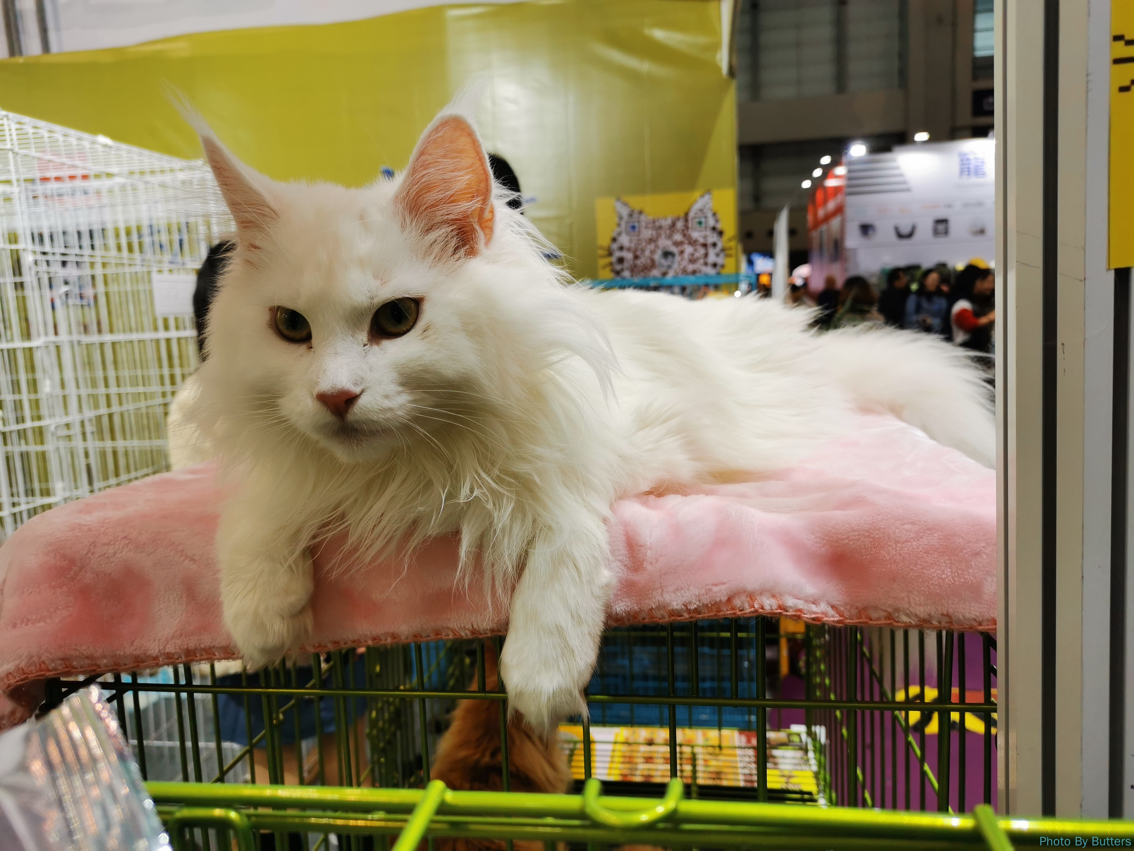 猫中的核心地位属于布偶猫,几乎每个摊位都有很多只。但最吸引人的是缅因猫,因为性格温顺可以放在外面任人摸。只是表情看起来并不太情愿。