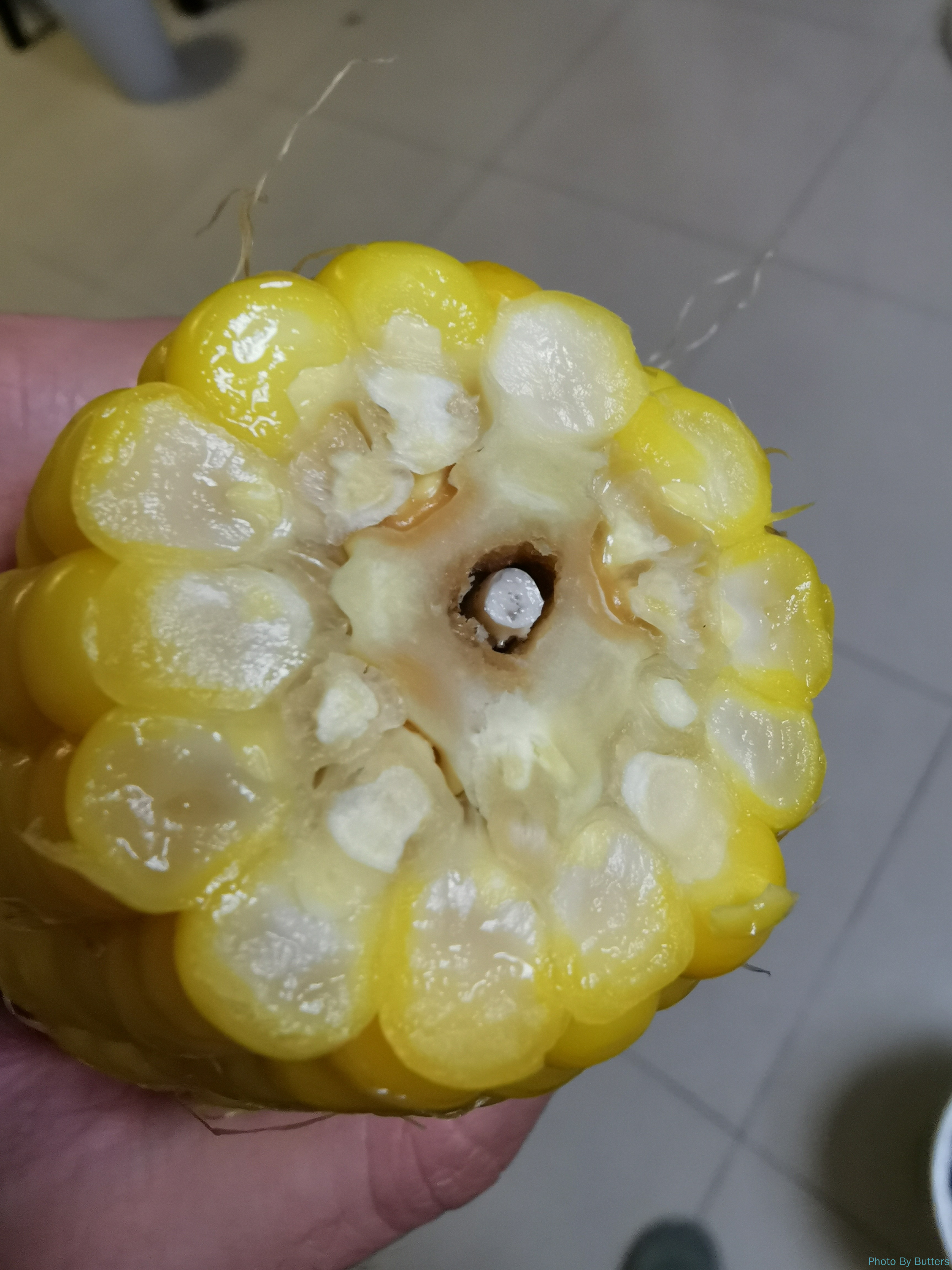 又一次看到苞米中的虫子,这次被横切,露出白白的截面。