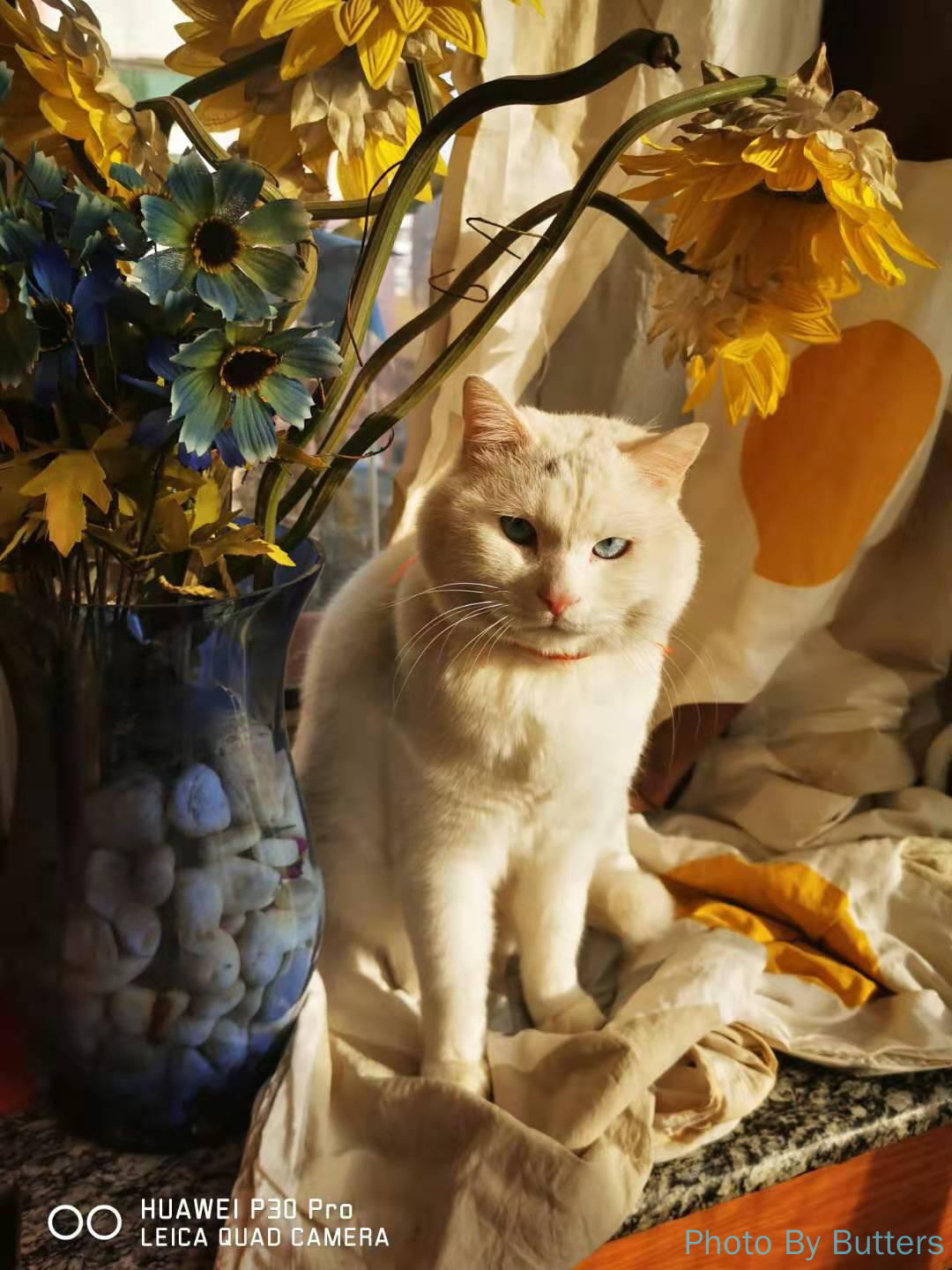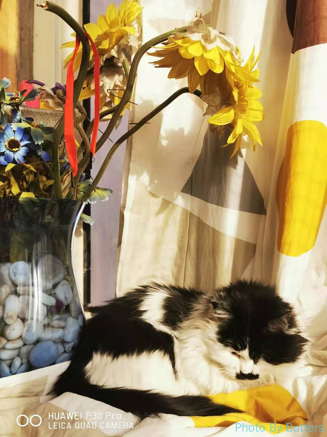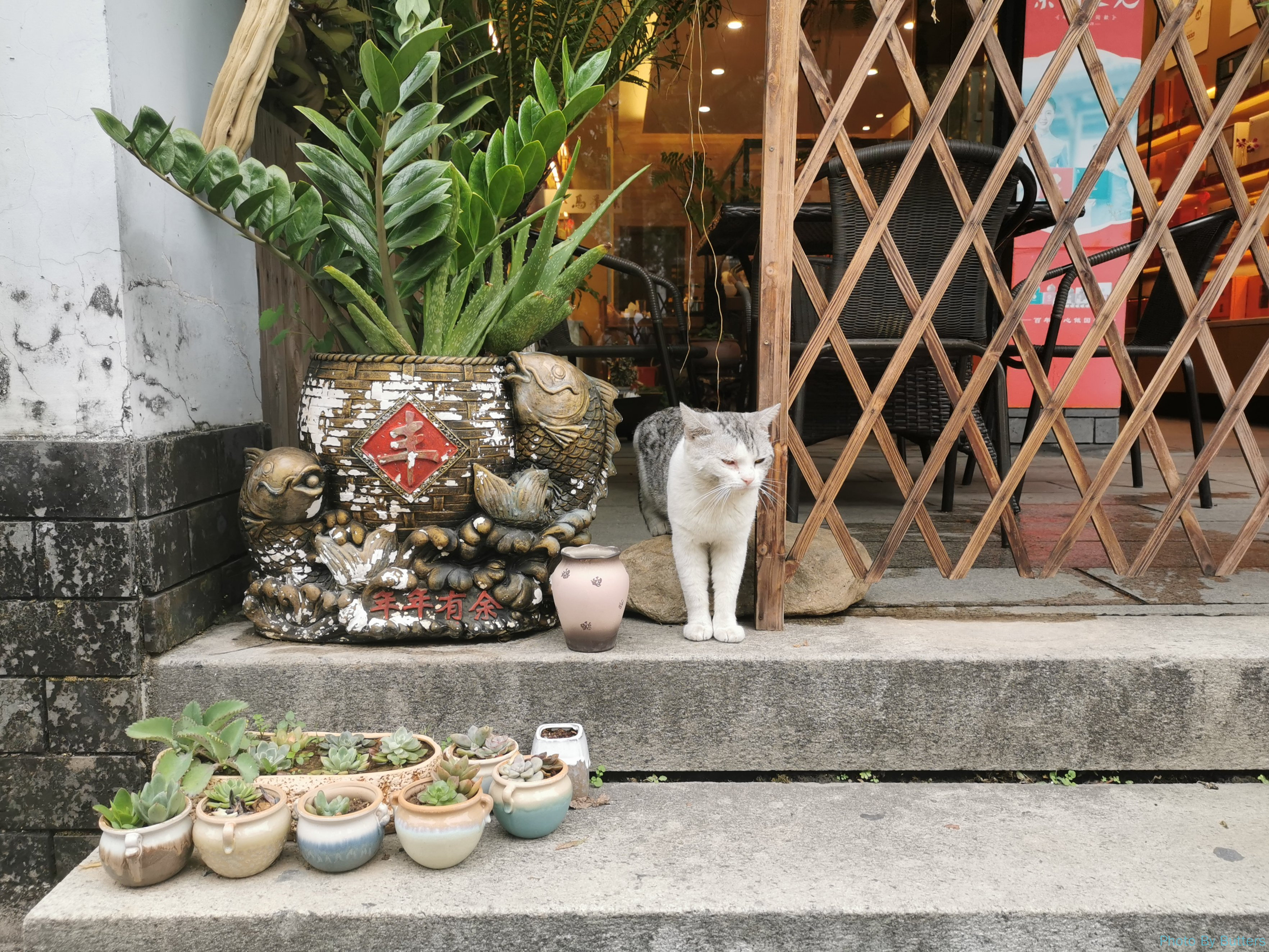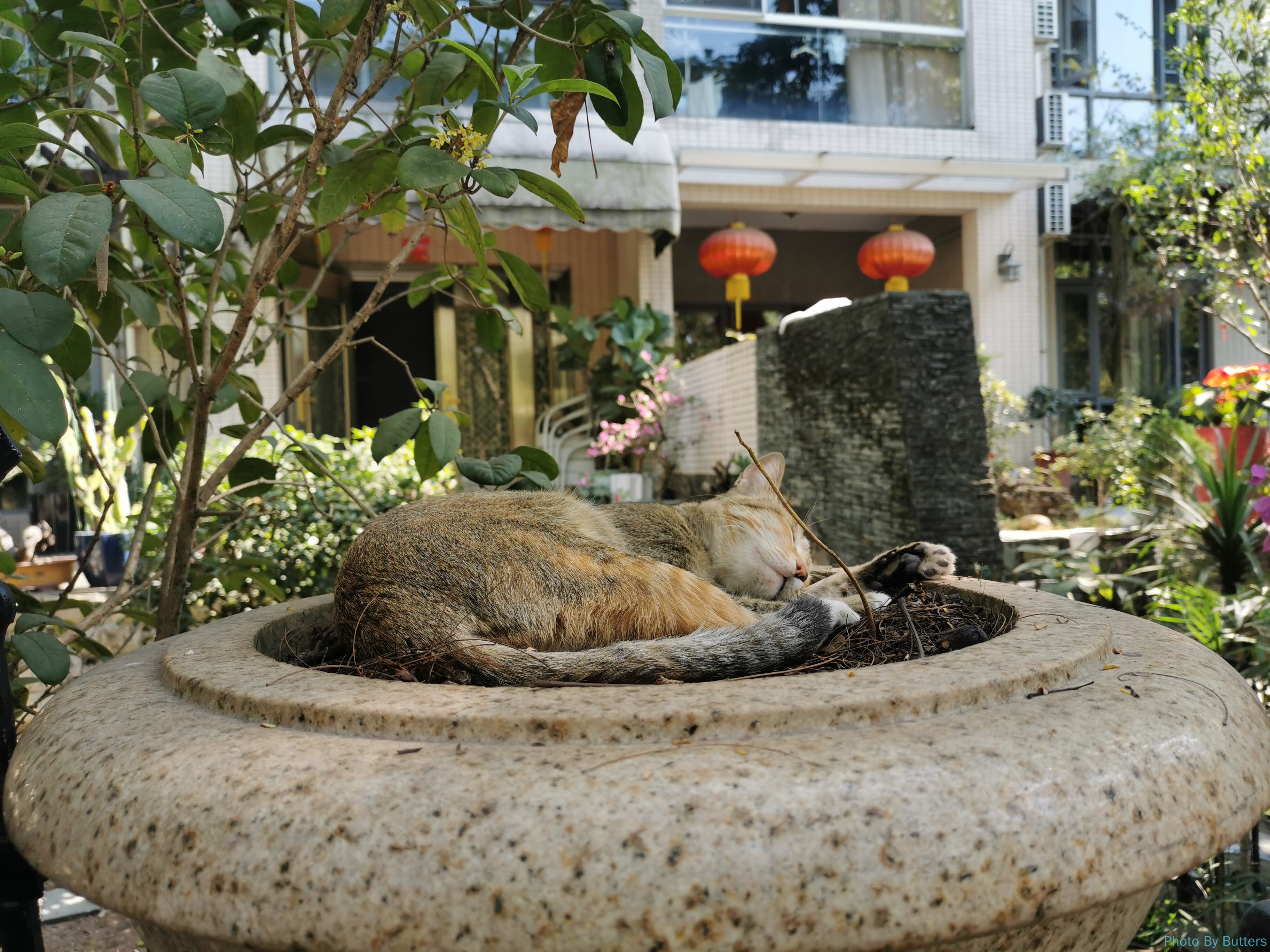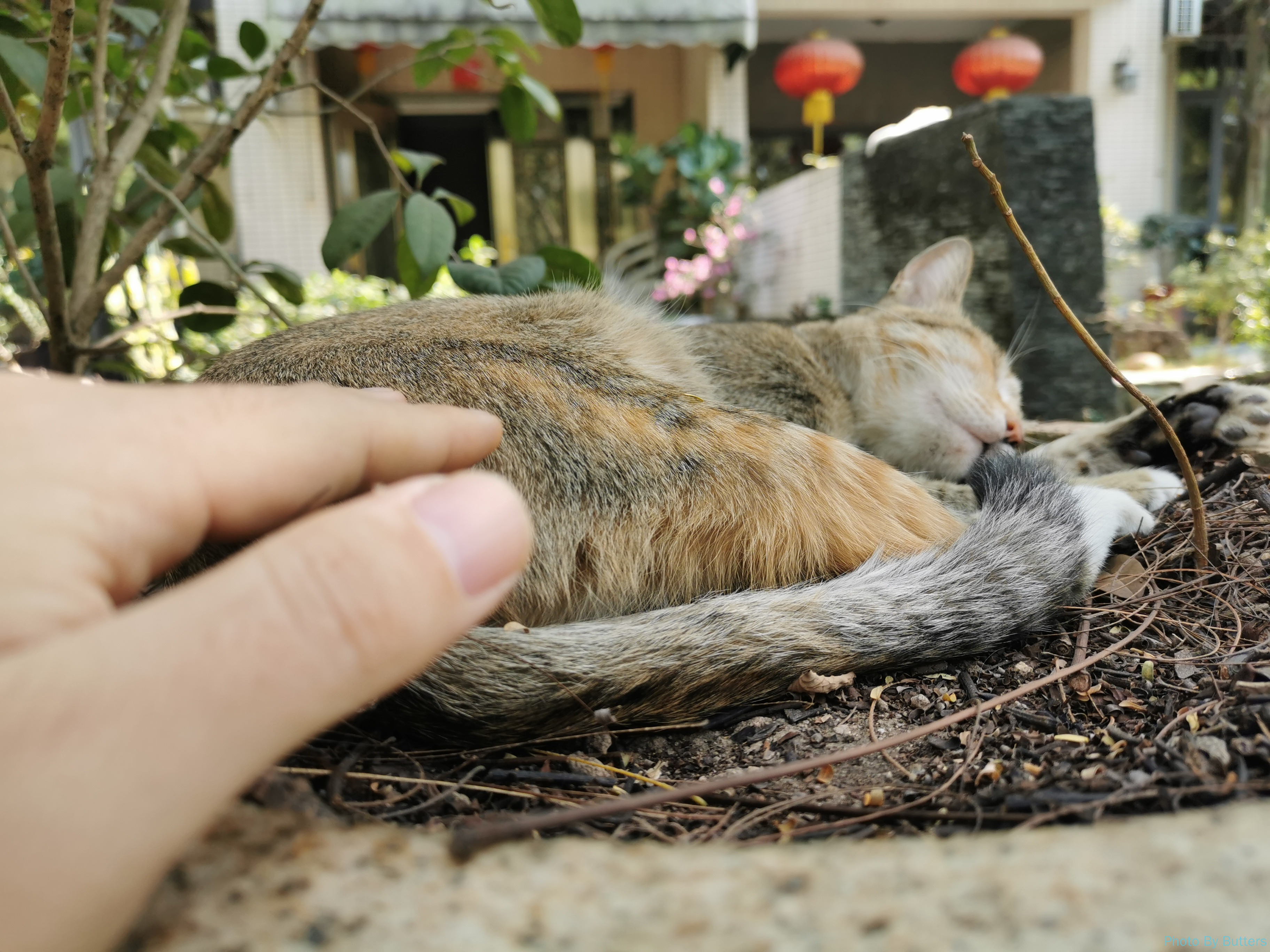 路过一个安静的小巷,一只猫在空花坛上睡觉,一只在墙头上睡觉。忍不住去摸一下,也没有醒来。