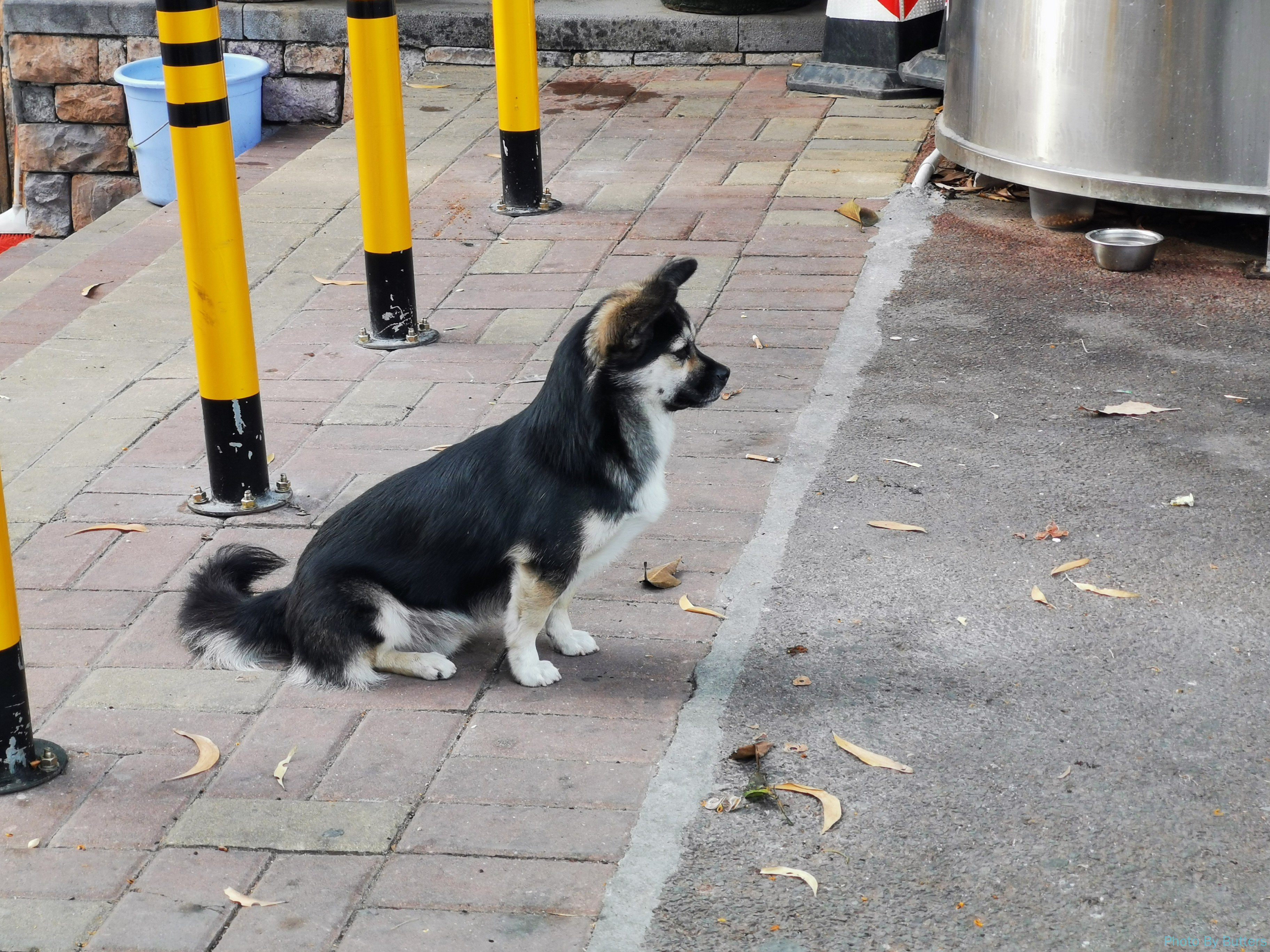 雅宝水库的值班室常驻两只小狗,保安有时会带着它们到山里溜达。这天早上一只狗在上坡的尽头好像在等人来。