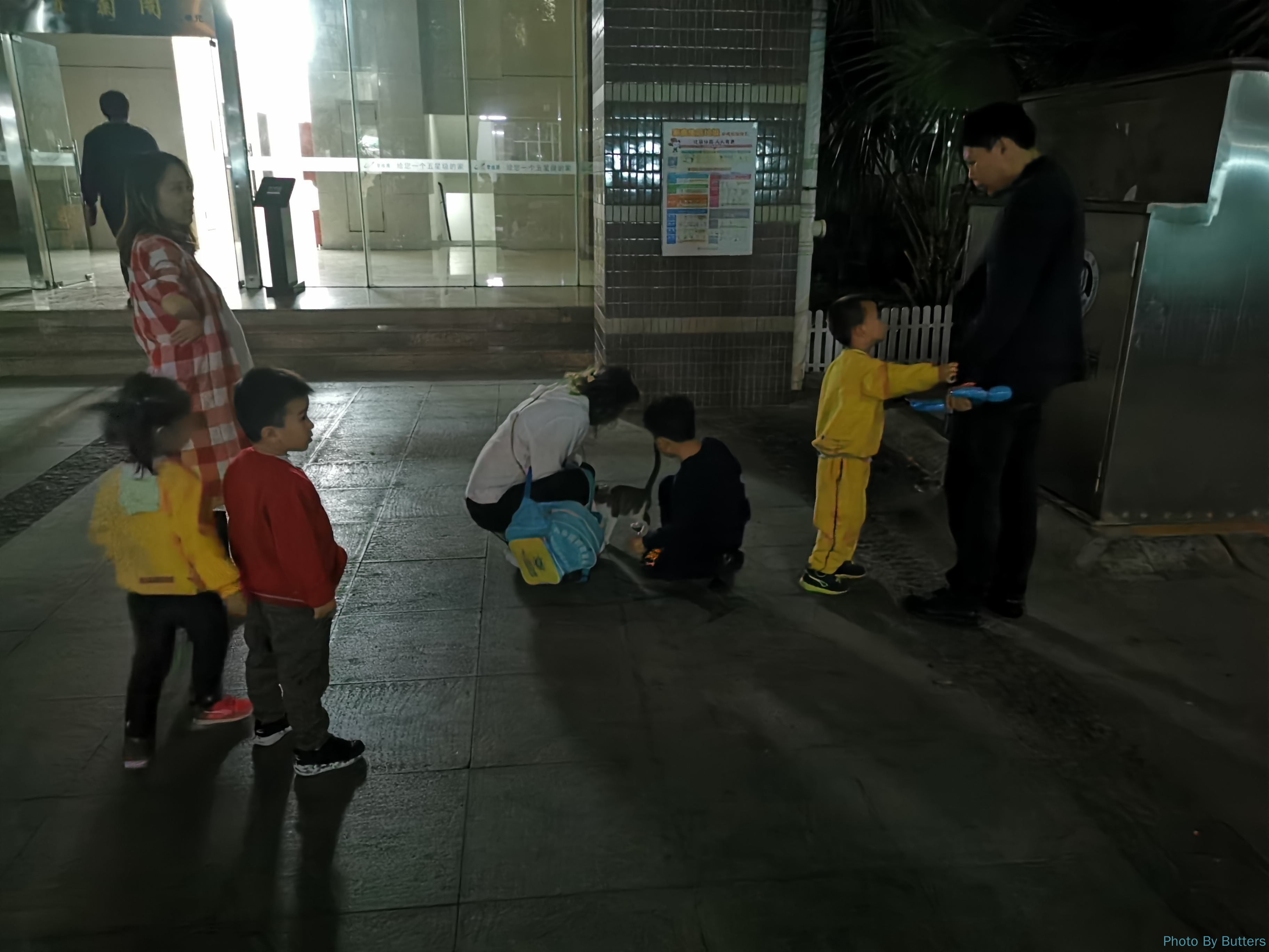 小区楼下出现一只不怕人的小猫,吸引了很多小孩子围观。有的小朋友问家长可不可以带回家养。