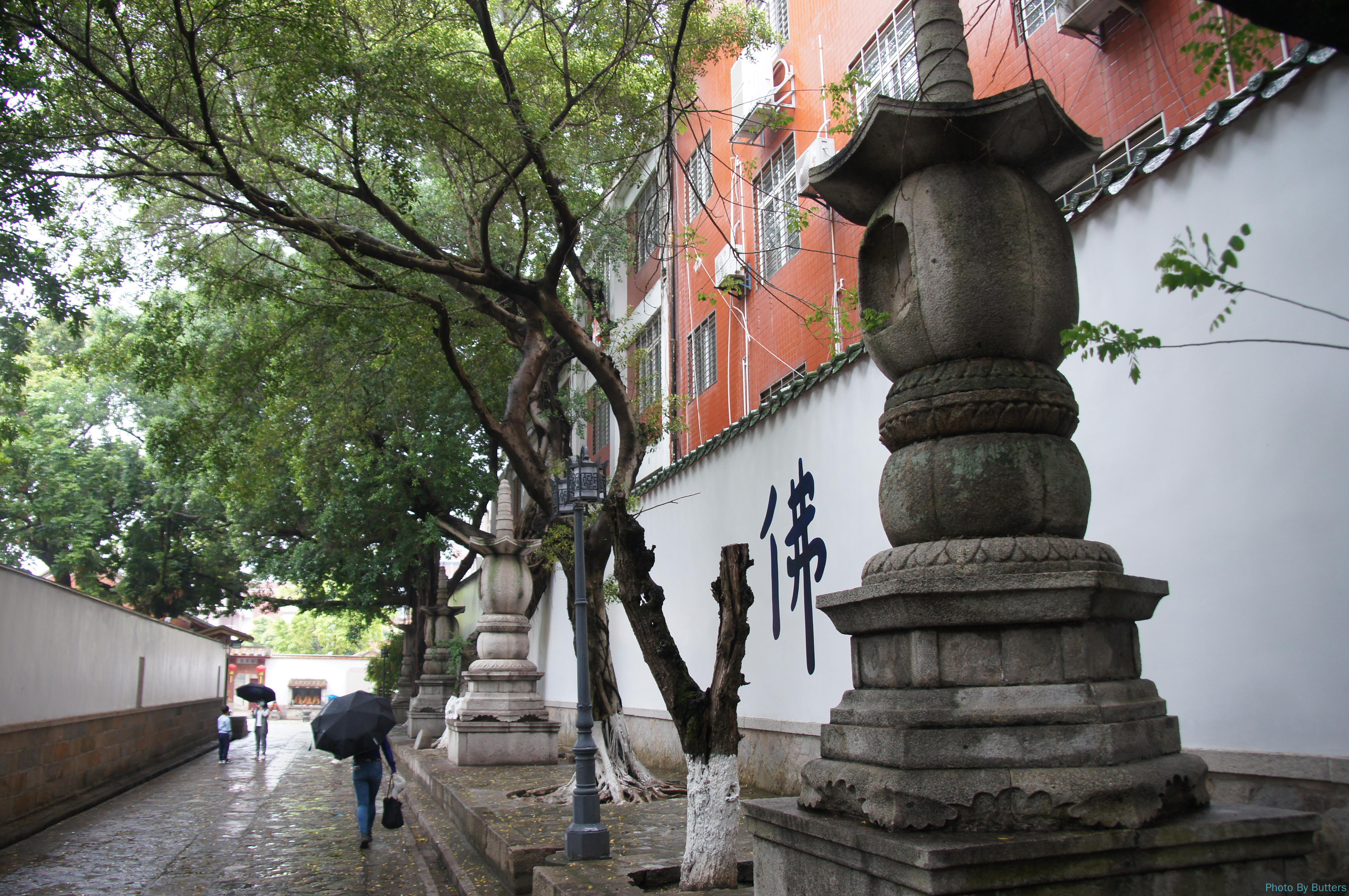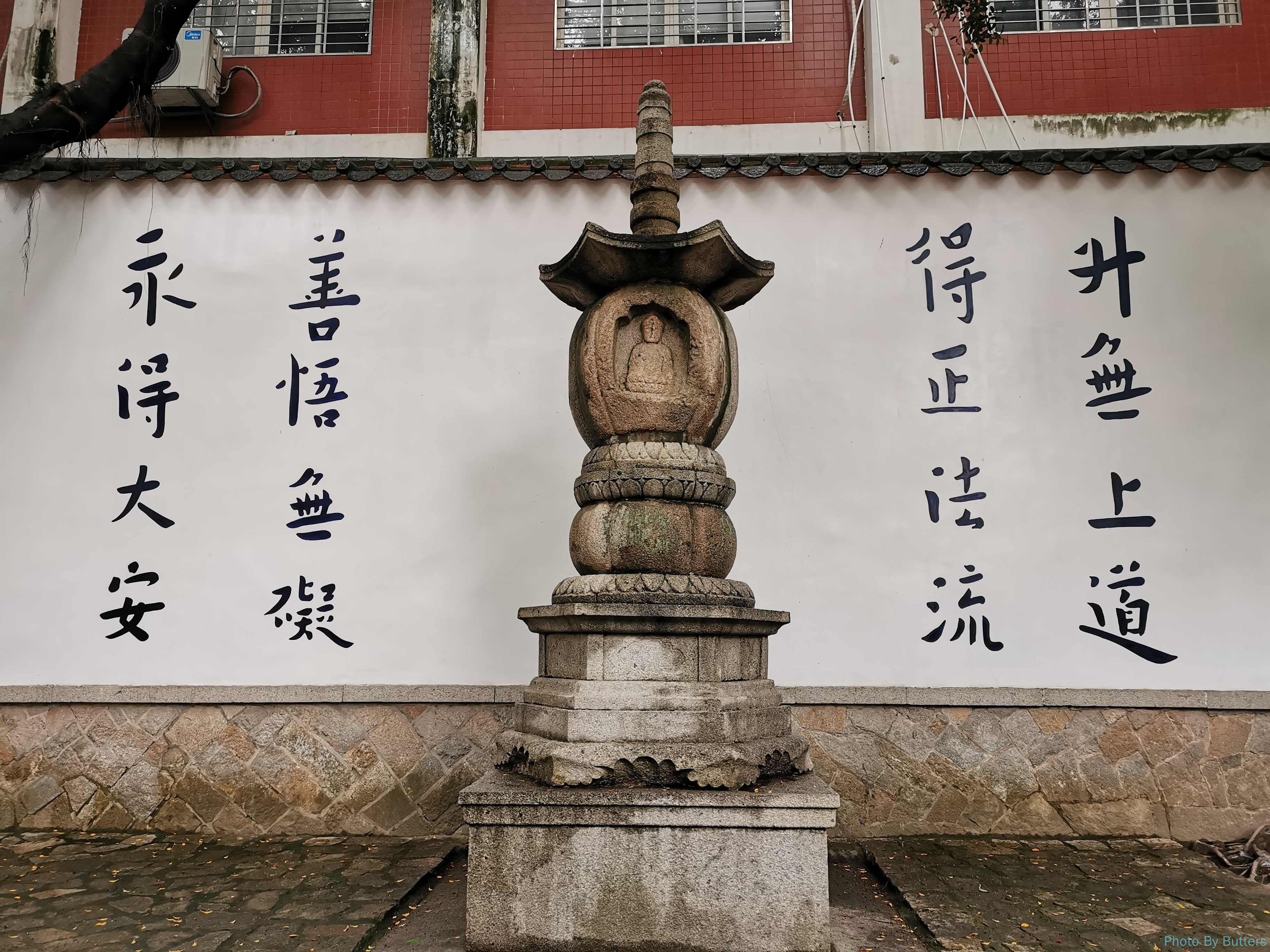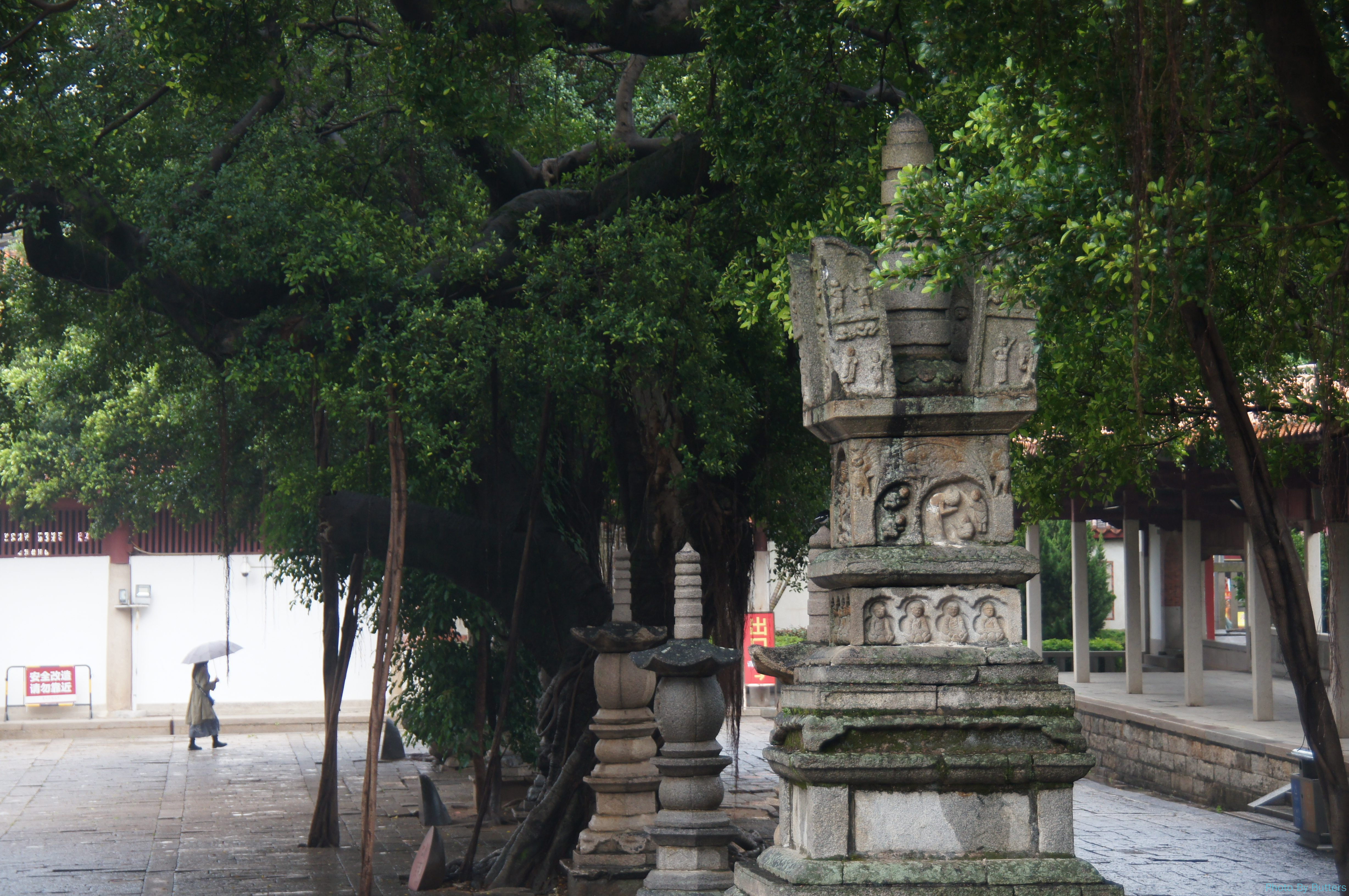 承天寺,旧称月台寺。位置稍隐蔽一些,附近也没有西街那么热闹。虽然弘一法师的纪念馆在开元寺,但他的僧籍是落在承天寺的,这也是他的化身处(火化处)。已经邻近了关门的时间,我们快速地消化掉手中的炸醋肉后进了大门。走进寺门后是一个长长的通道,右侧是七座宋代的佛塔,白墙上印的字是弘一法师的手迹。大悲殿中正在诵经,担心正门快要关了,我们快速走了一圈就离开了。