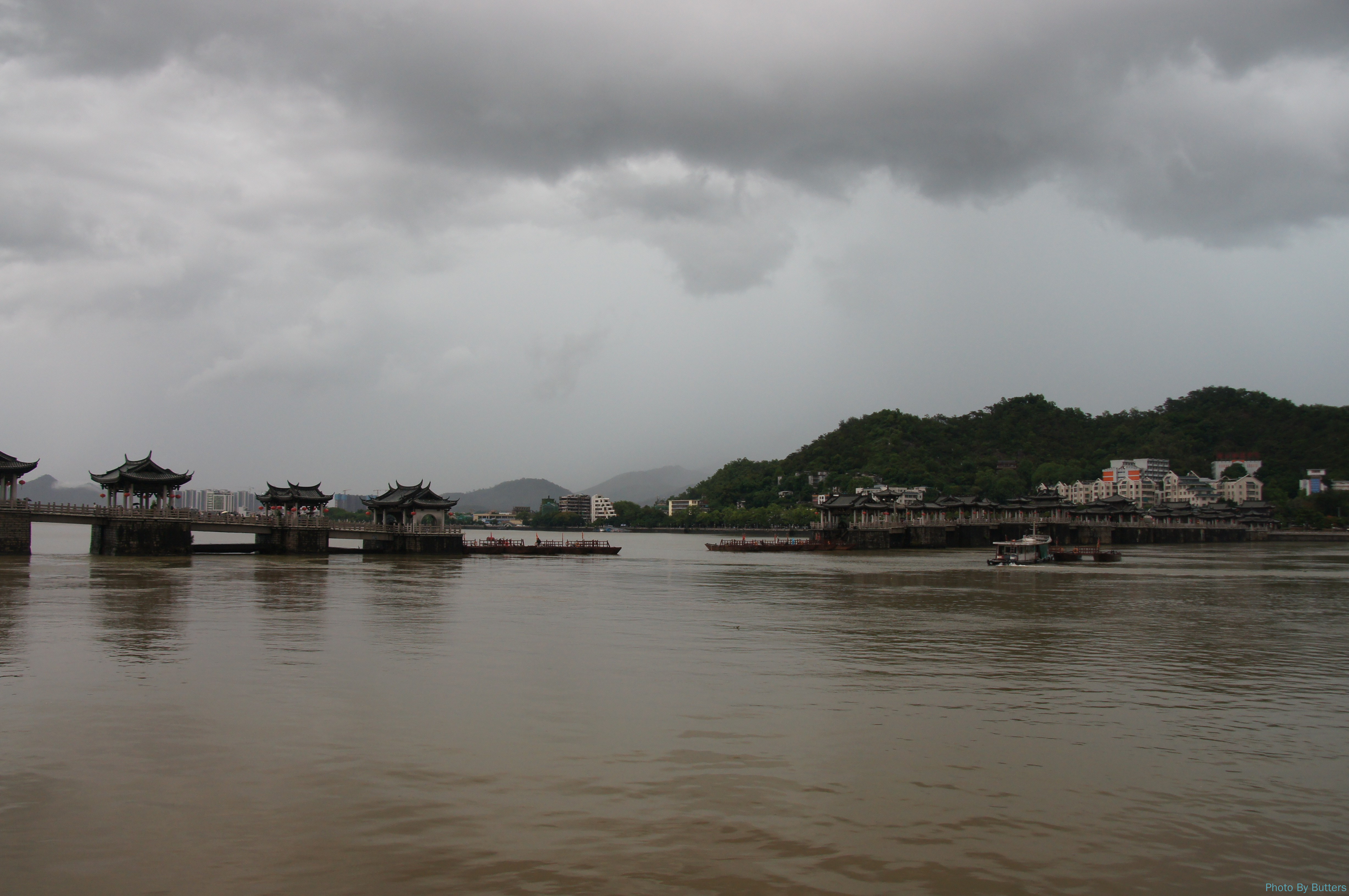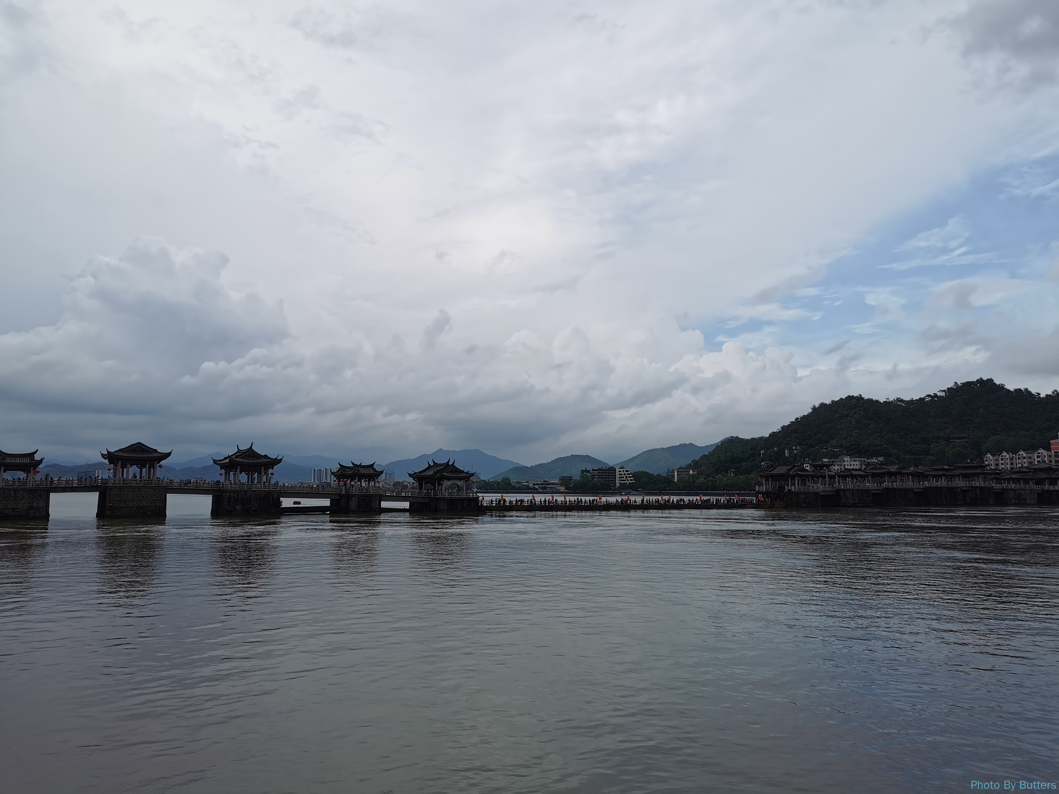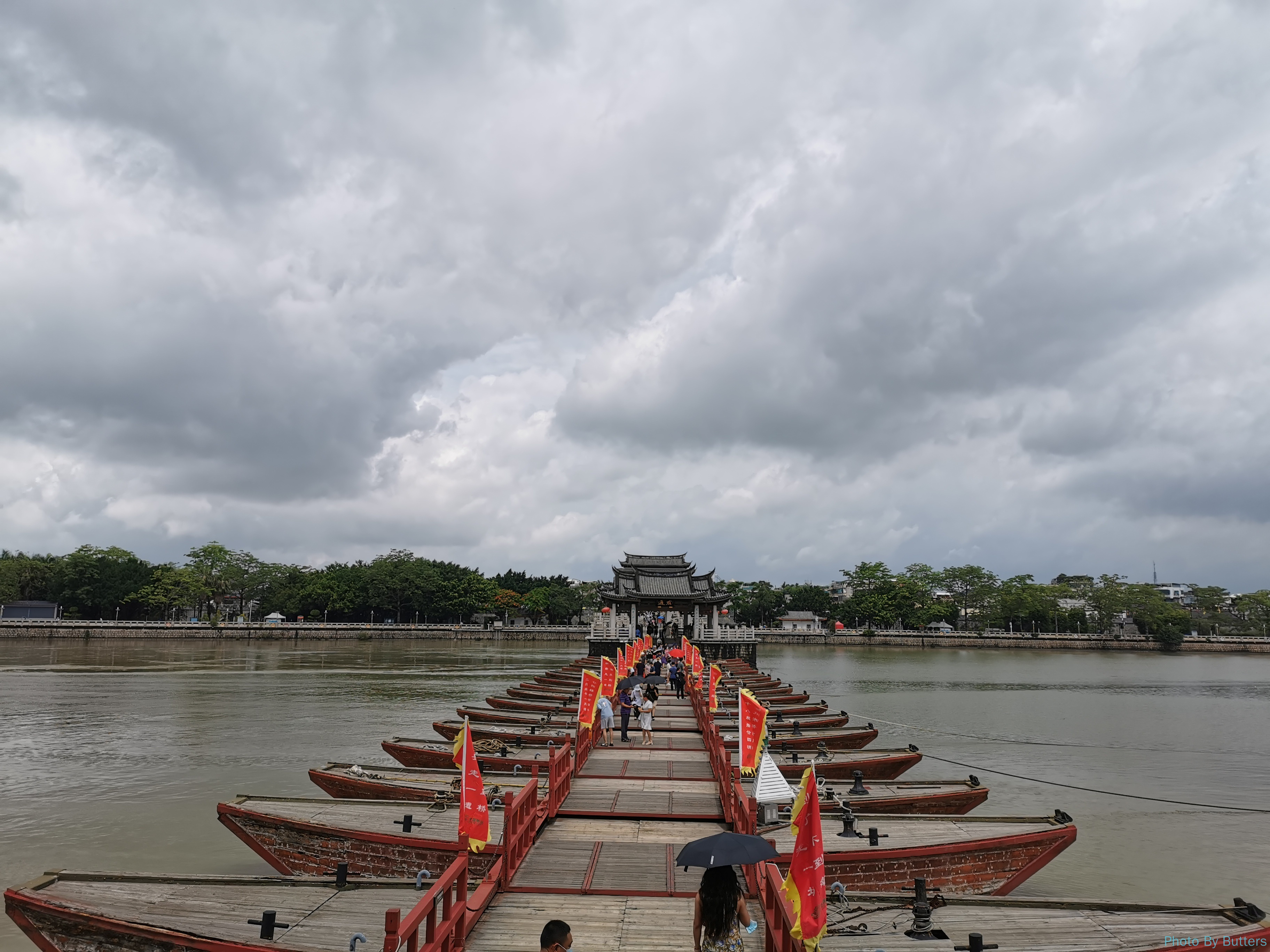 第一天我们本想顺着韩江边走去吃晚饭,没想到遇到暴雨被困在了亭子里。雨停后正好看到了广济桥中间的浮桥被一个个地拖走了。潮州果然是慢节奏,一座桥六点钟也都可以下班了。