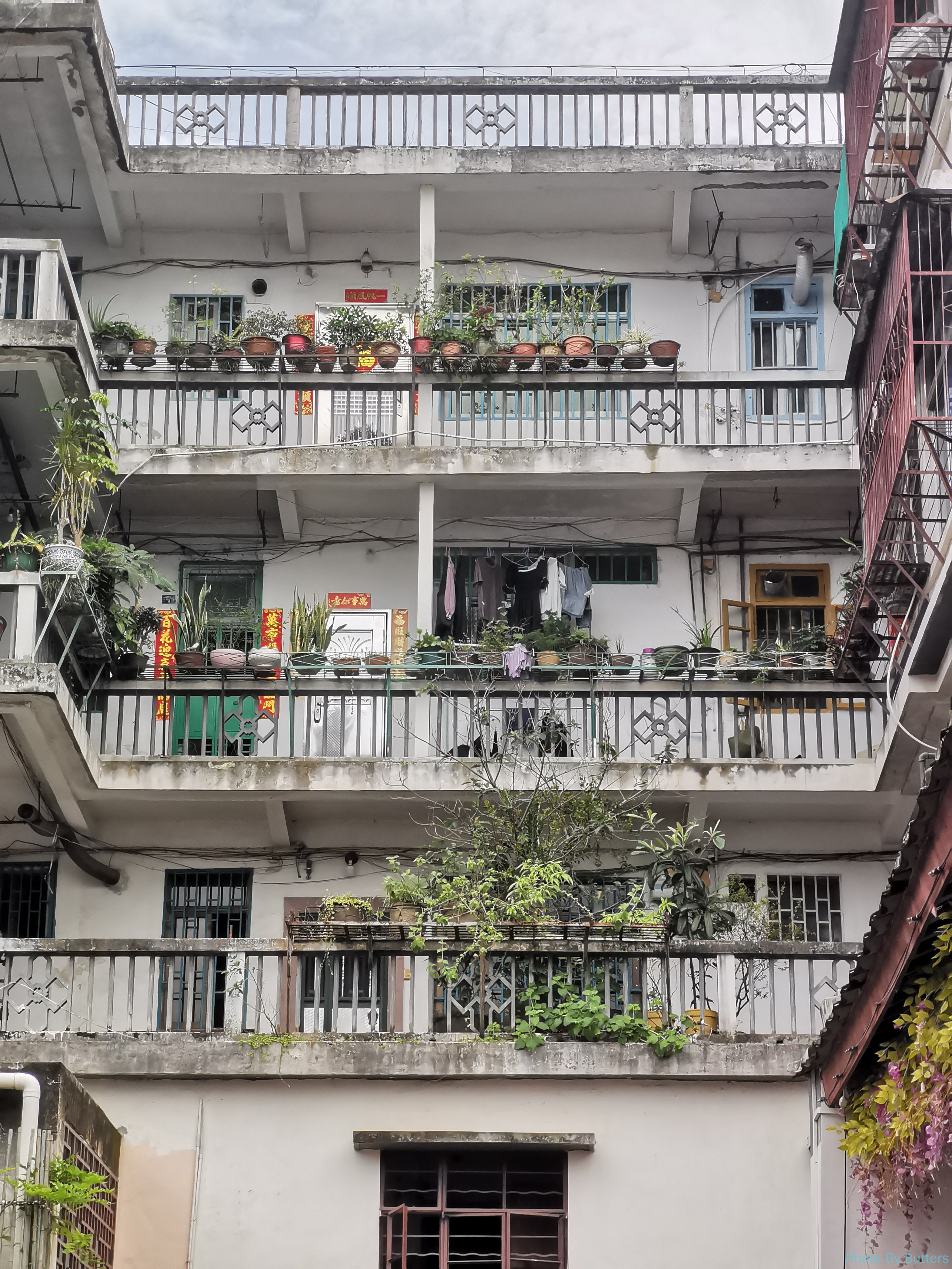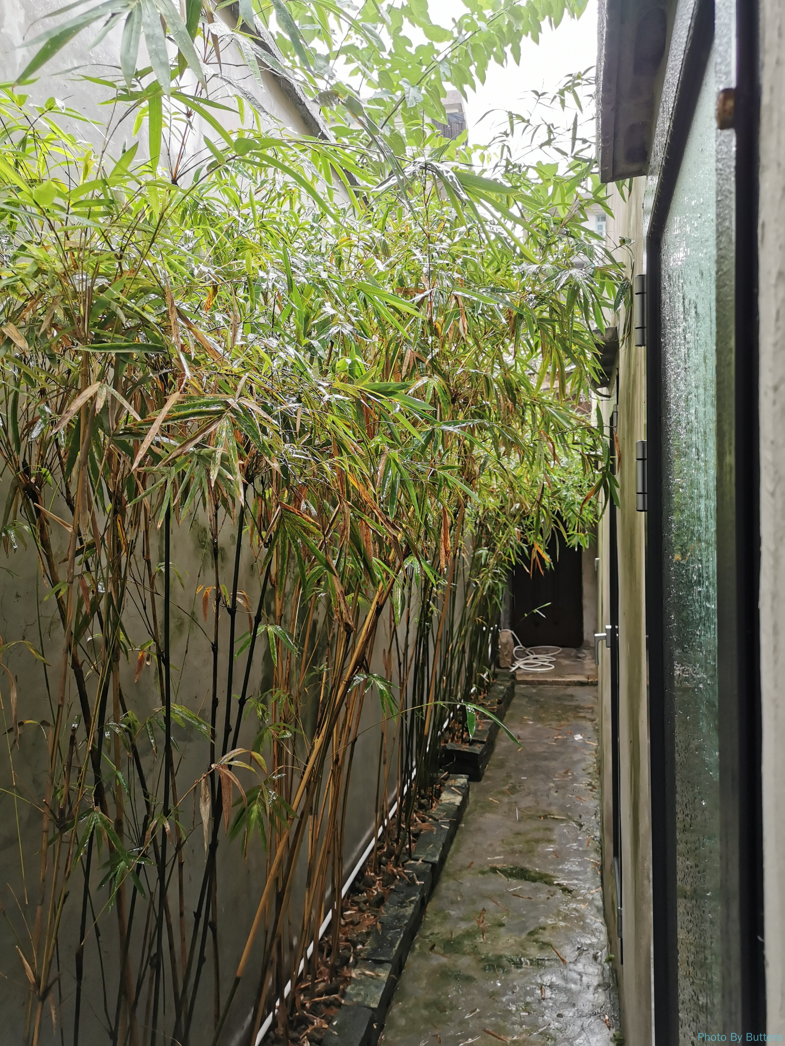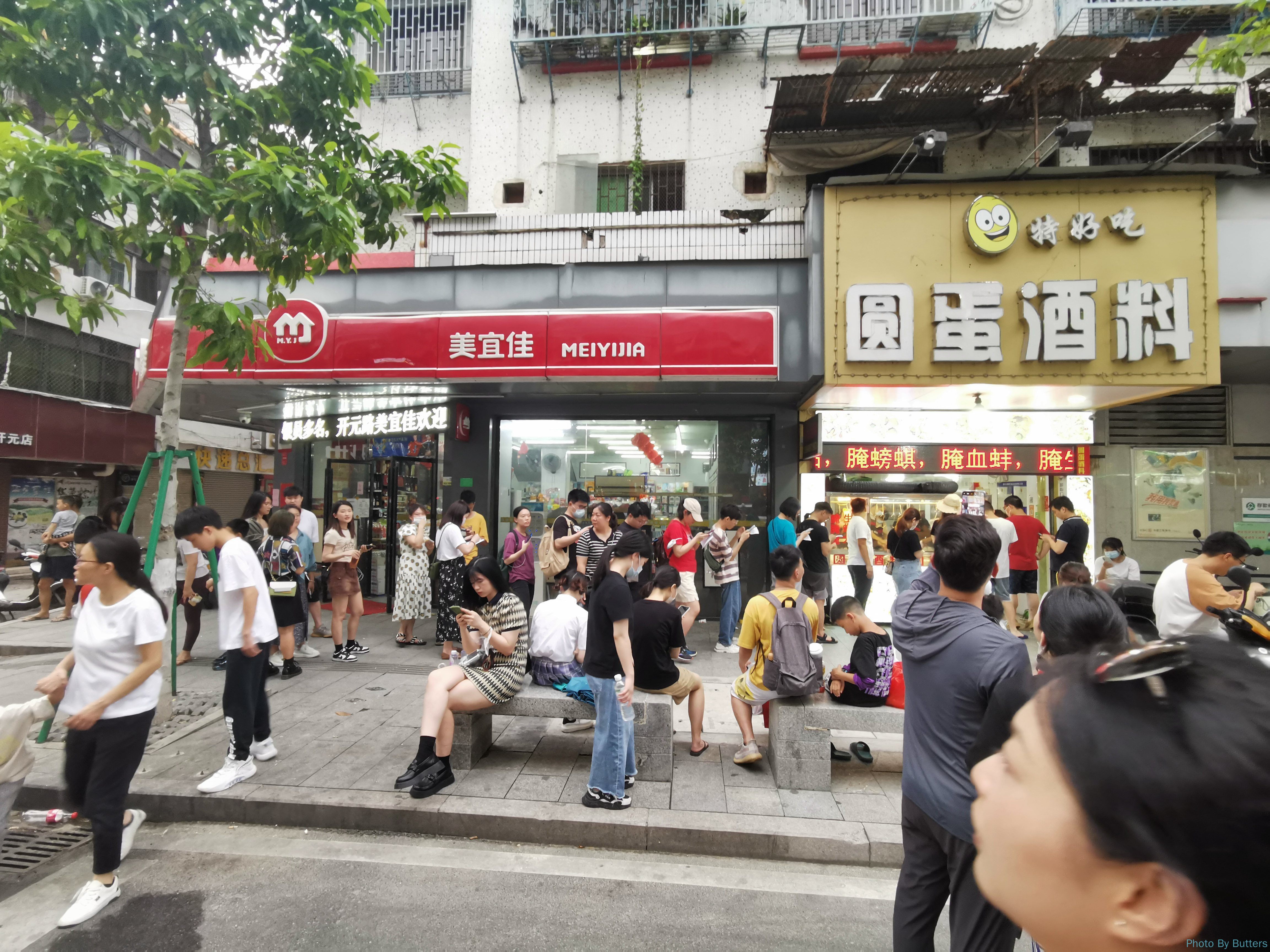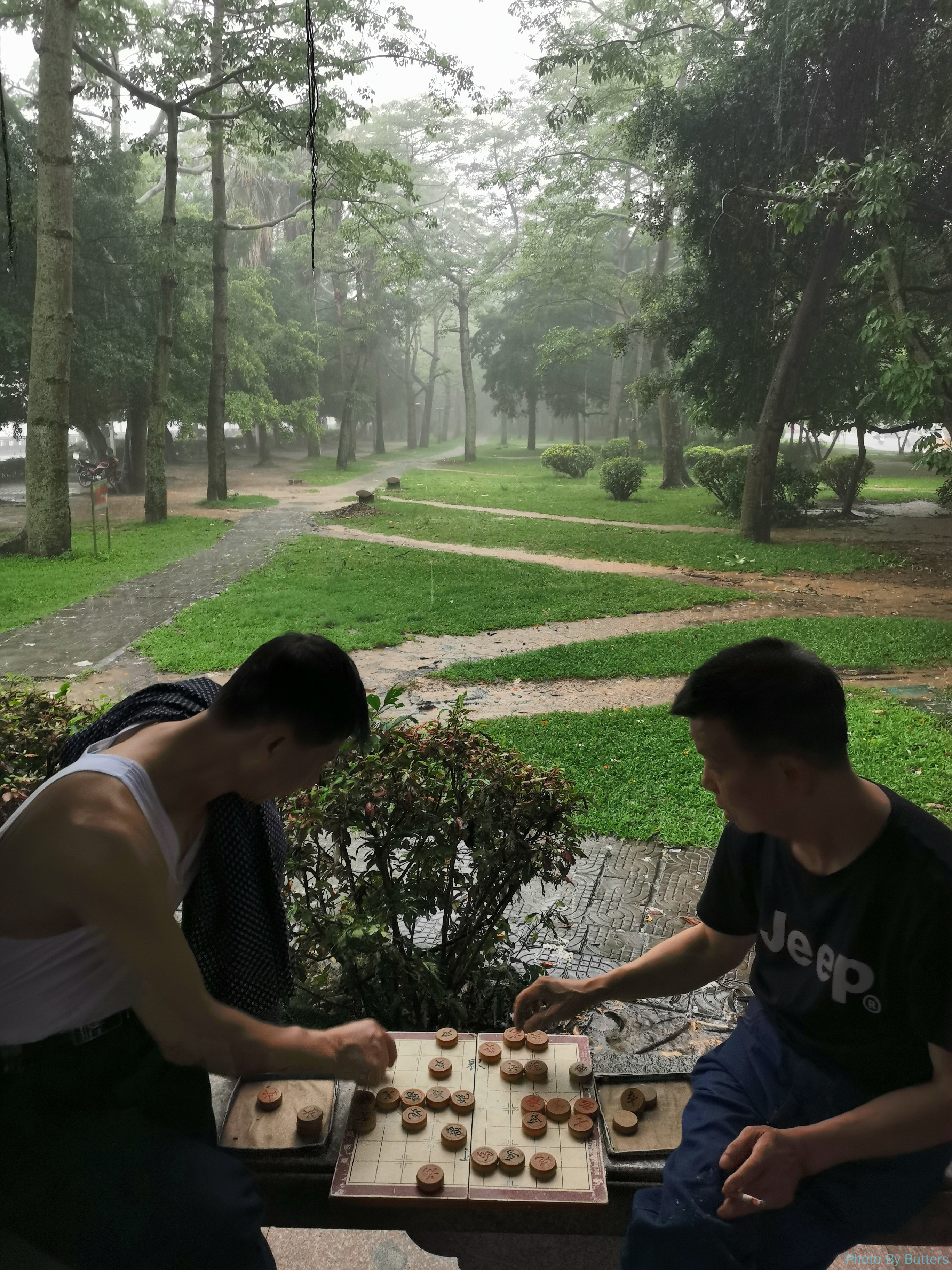 在古城里的第一次下雨,我们躲进了巷子里的咖啡店休息了一会儿。第二次下雨就没那么幸运了,我们刚好走到了古城外的韩江边上,突然下起了暴雨。我们赶紧躲进了江边公园的一个长廊里,里面原来只有几堆下棋的人,不久后就挤满了躲雨的人。长廊比较窄,一点小风就会把暴雨吹进来。江对岸的山和楼已经完全看不出轮廓了。而下棋的人不为所动,仍沉浸在棋局中。