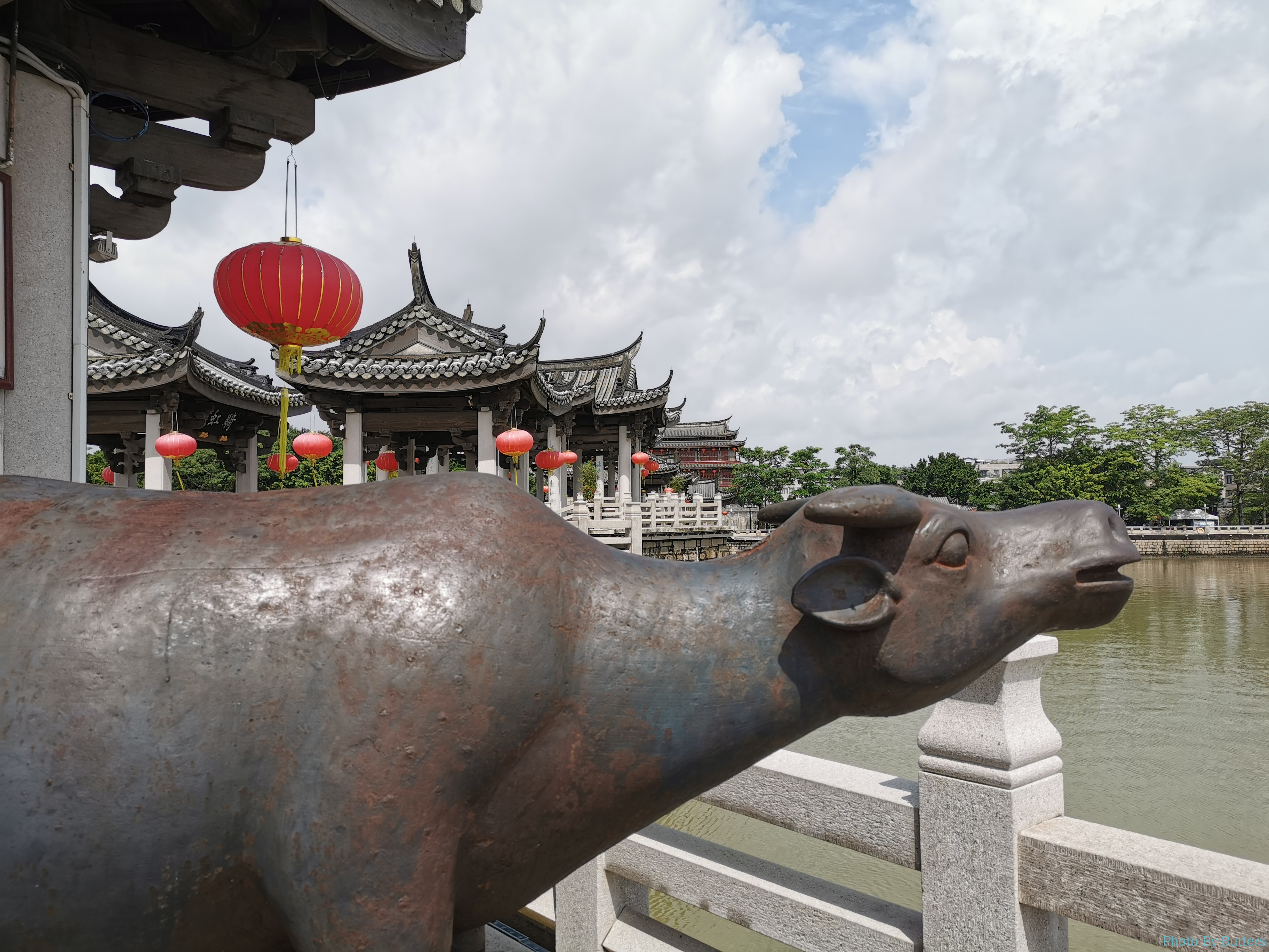 原本桥上两侧各有一头镇桥的鉎牛,道光二十二年(1842 年)被洪水冲走了一头。据说后来找到了,可惜两头都被大炼钢铁了。现存的为按照片重铸的,一头放在桥上,另一头放在了砚峰山。345